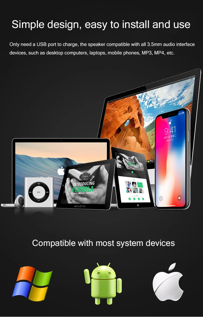 Нужен только порт USB для зарядки, динамик совместим со всеми устройствами с аудиоинтерфейсом 3,5 мм, такими как настольные компьютеры, ноутбуки, мобильные телефоны, MP3, MP4 и т. Д.