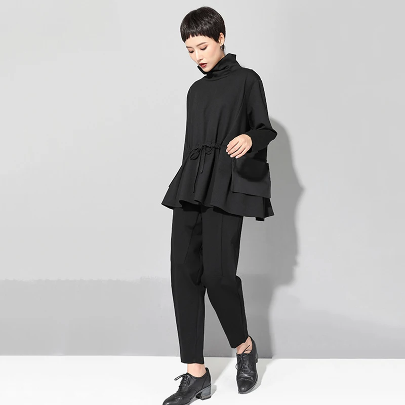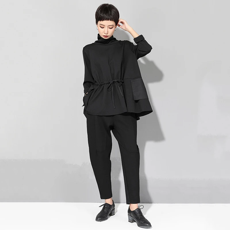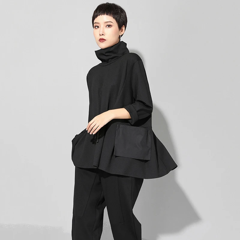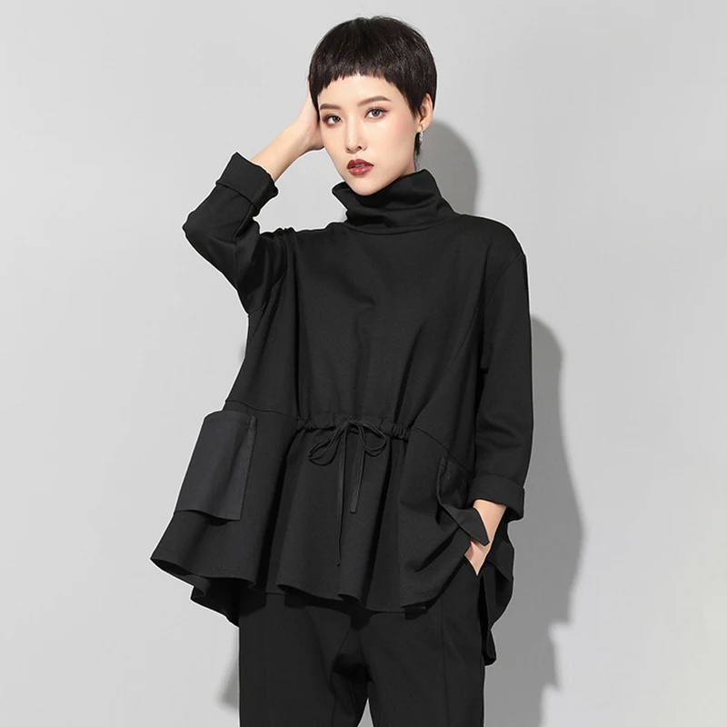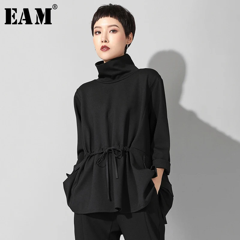 EAM 2022 Новинка весна осень Высокий воротник длинный рукав черный свободный Карман Drawstring большой размер футболка женская мода JQ017