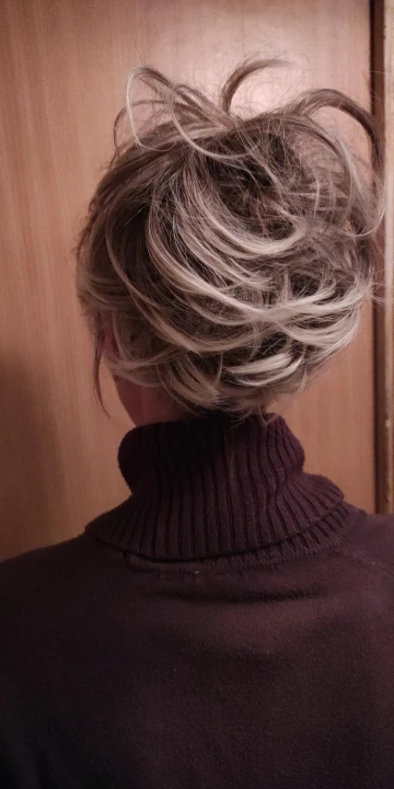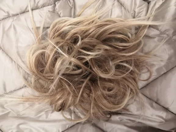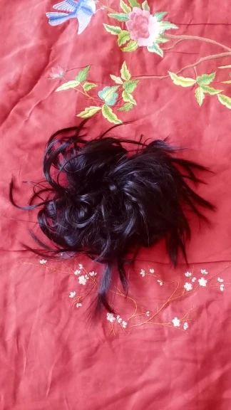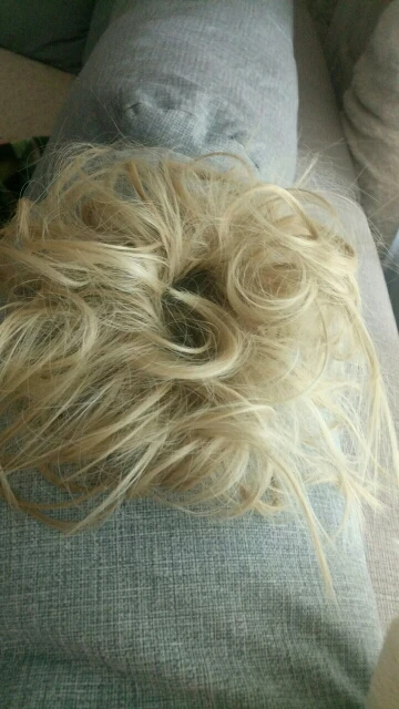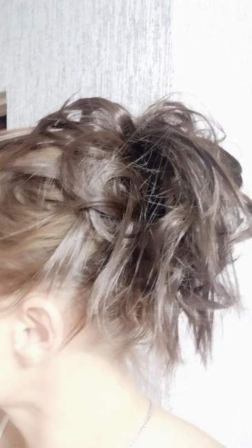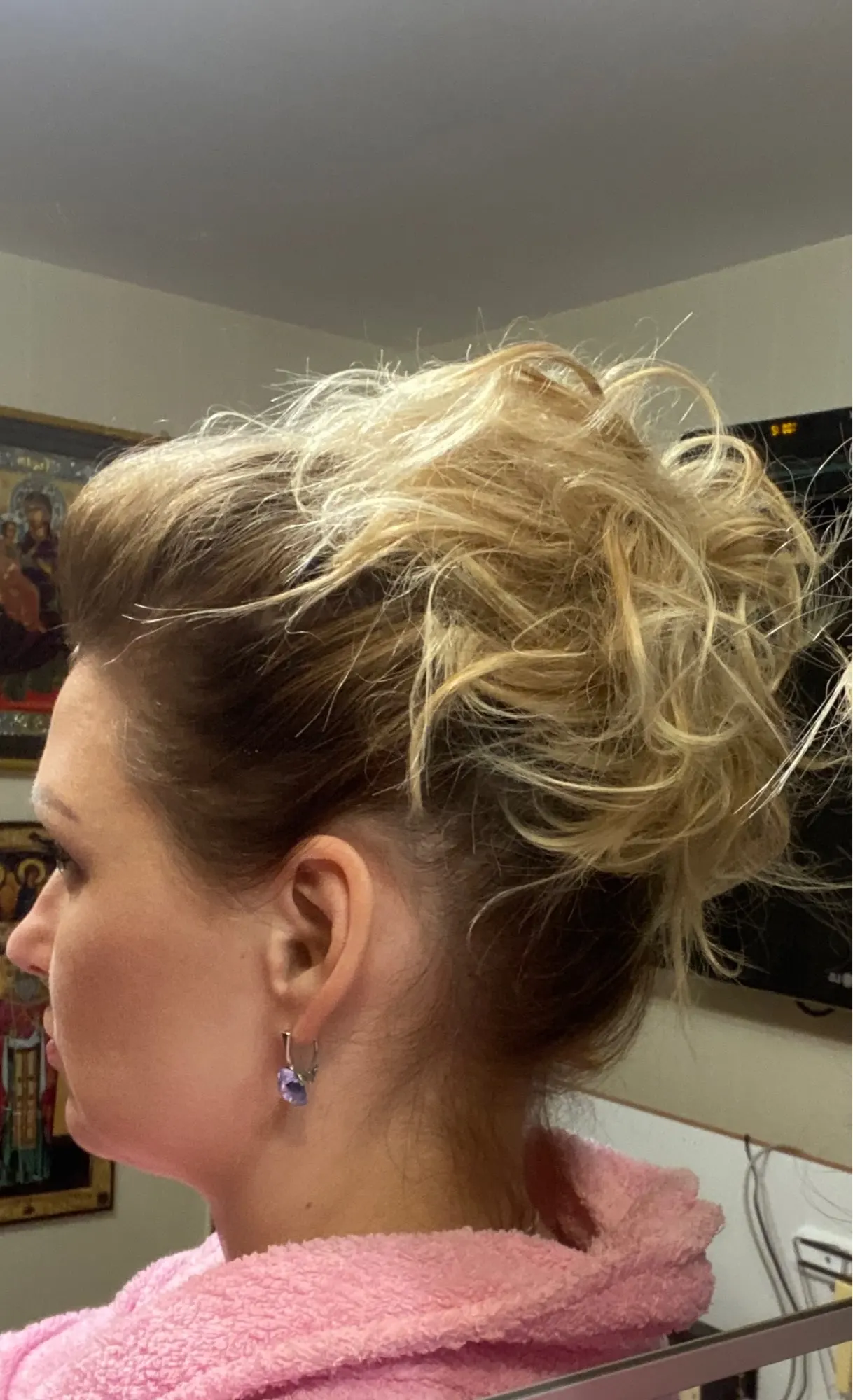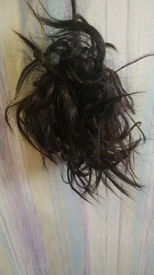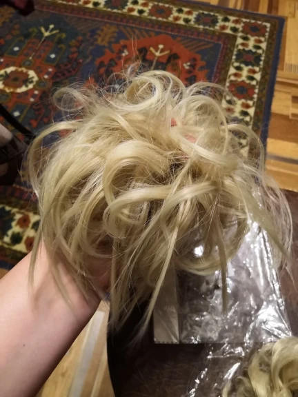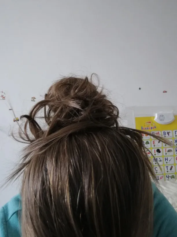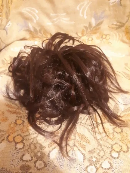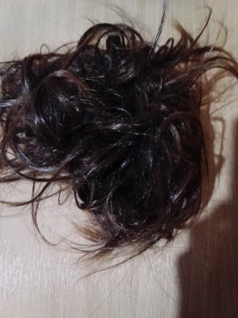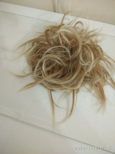 Странный пучок ,однако, получается с данной резинкой. Однозначно нужно делать сначала шишку из своих волос, закреплять обычной резинкой и только после этого надевать шиньон. И для надёжности придется подкалывать шпильками, иначе он может сползти. То что волос искусственный-видно невооружённым глазом, особенно при искусственном освещении. В люди я бы не стала выходить с этой штуковиной. Резинка сама по себе какая-то лохматая, пряди торчат во все стороны, смотрится совершенно не аккуратно, только шпильки и невидимки в помощь. Попробую ещё с ними...но я ожидала лучшего. Оценку не снижаю, т.к. описание было точным. Цвет почти подошёл, мои русые волосы чуть темнее. На фото 'прическа' выглядит лучше чем в реале.