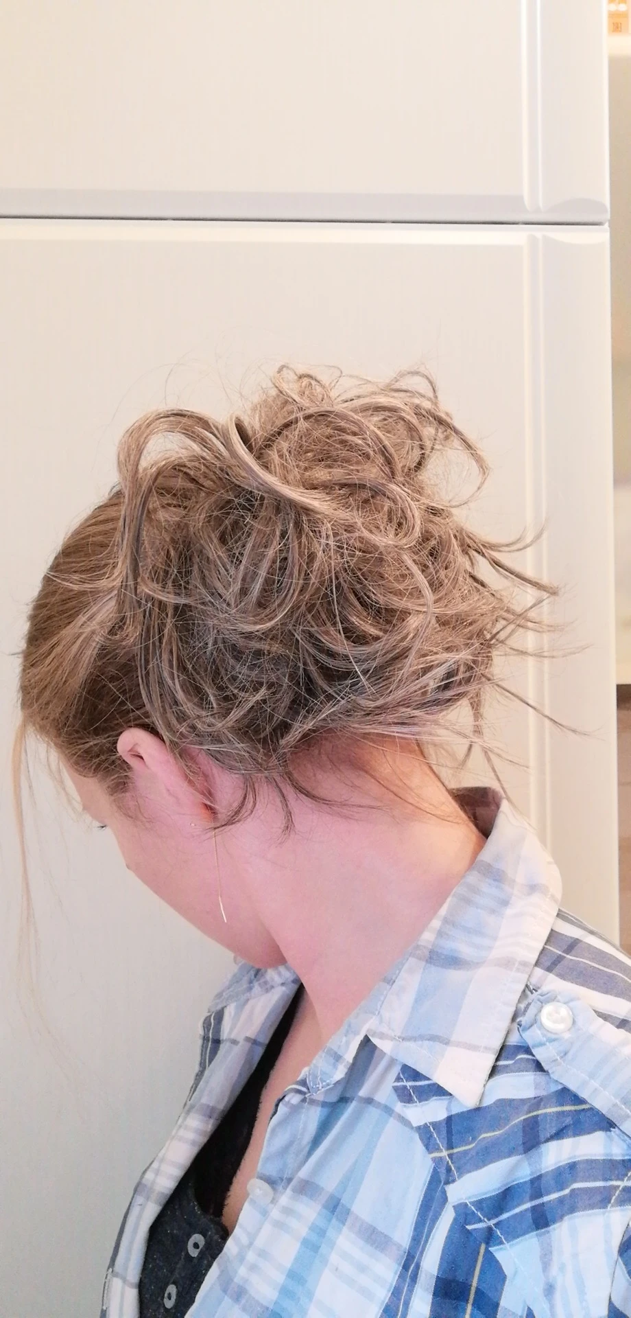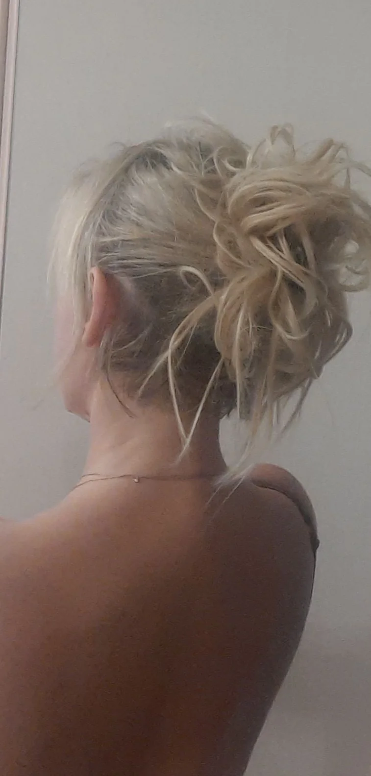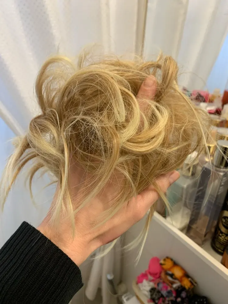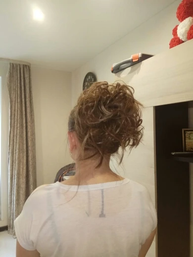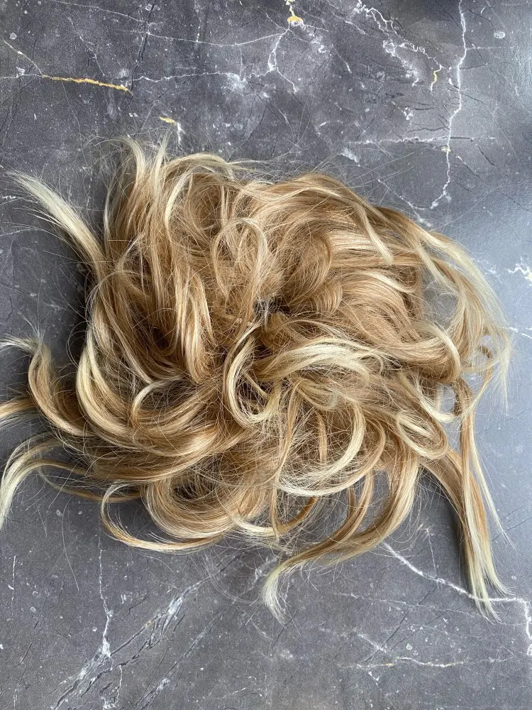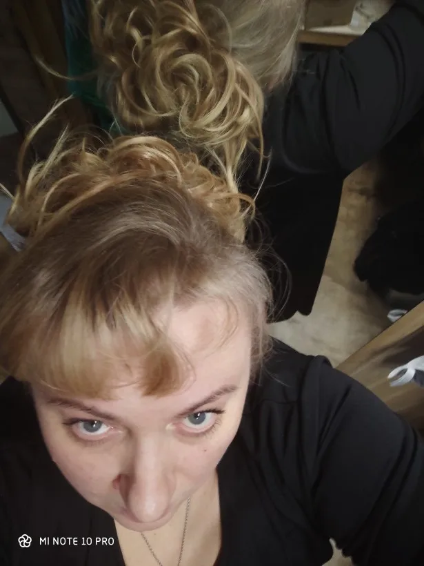 Странный пучок ,однако, получается с данной резинкой. Однозначно нужно делать сначала шишку из своих волос, закреплять обычной резинкой и только после этого надевать шиньон. И для надёжности придется подкалывать шпильками, иначе он может сползти. То что волос искусственный-видно невооружённым глазом, особенно при искусственном освещении. В люди я бы не стала выходить с этой штуковиной. Резинка сама по себе какая-то лохматая, пряди торчат во все стороны, смотрится совершенно не аккуратно, только шпильки и невидимки в помощь. Попробую ещё с ними...но я ожидала лучшего. Оценку не снижаю, т.к. описание было точным. Цвет почти подошёл, мои русые волосы чуть темнее. На фото 'прическа' выглядит лучше чем в реале.
