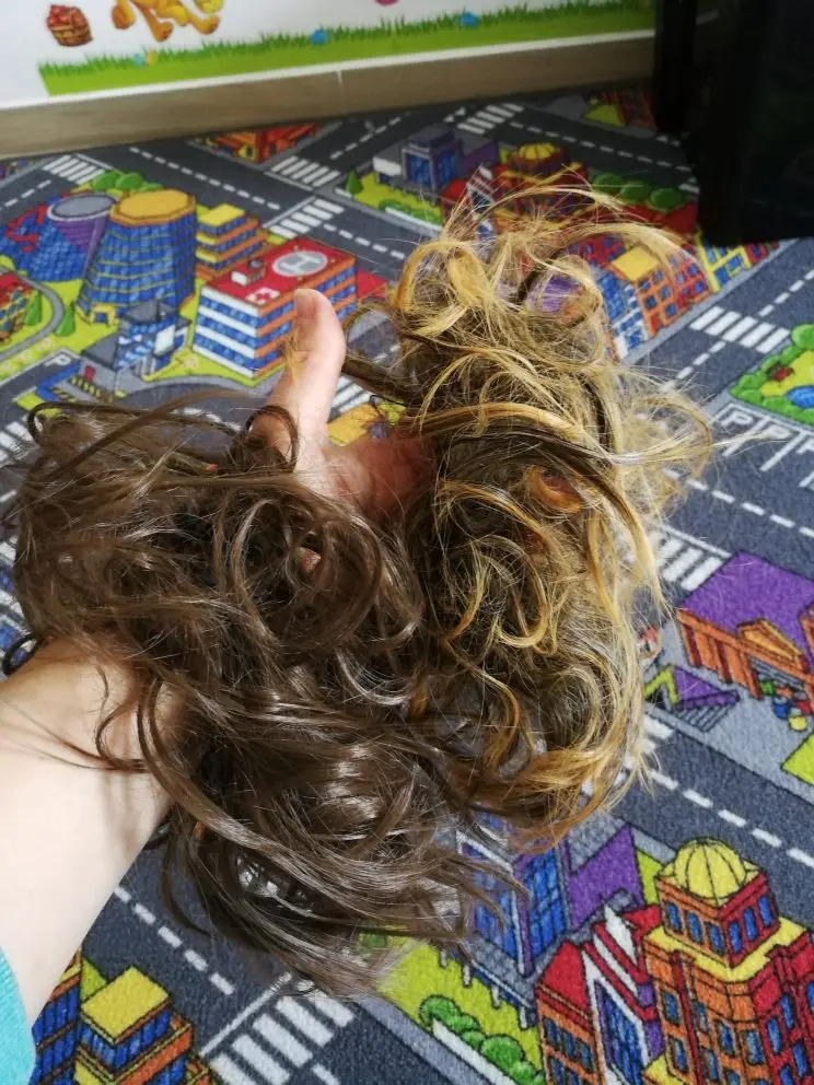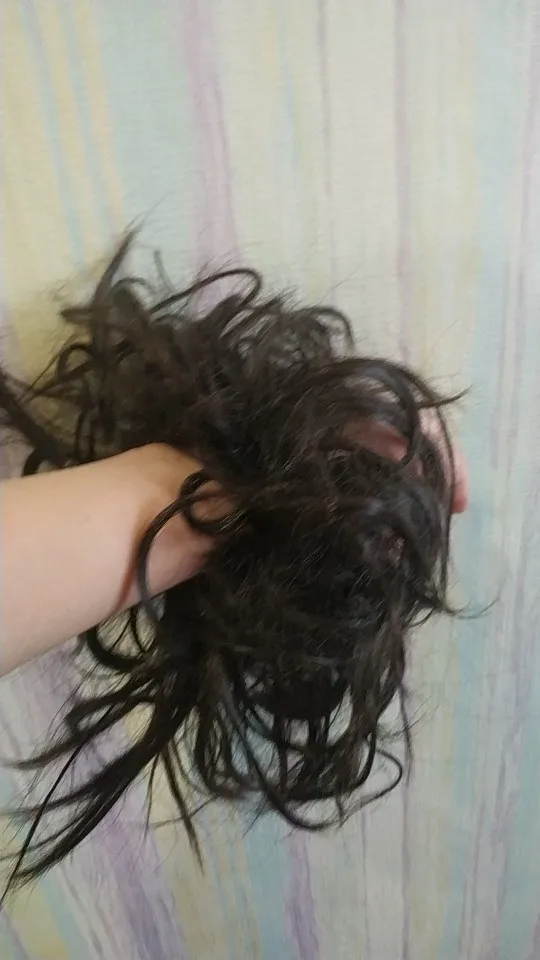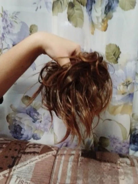 Сама по себе резинка огромная, ее раза три обернуть надо, чтоб держалась... И все равно не держится, т. к. Синтетический волос скользит. Подвытянула из волосянки саму резинку и намотала все енто на краб, вот теперь все норм, все держится, смотрится класно при дневном свете. Под лампами конечно блестит синтетическим блеском, да и фик бы с ним)) когда своих три волосинки в шесть рядов, то радуешься, как ребенок этой резинке))) натуральный шиньон из чьих - то волос я бы все равно не смогла бы носить))) заказала еще хвост, тоже пришла в восторг)))