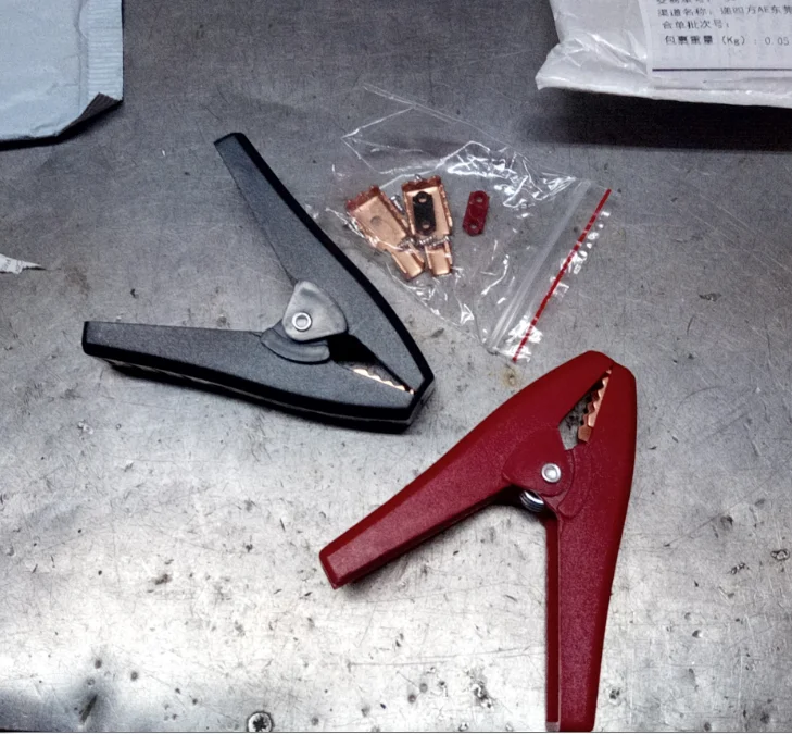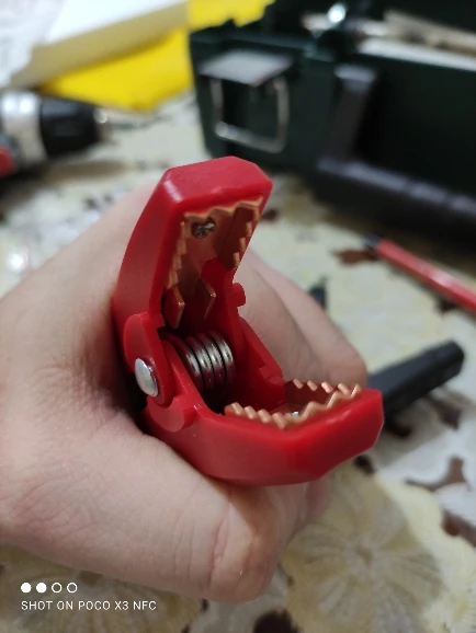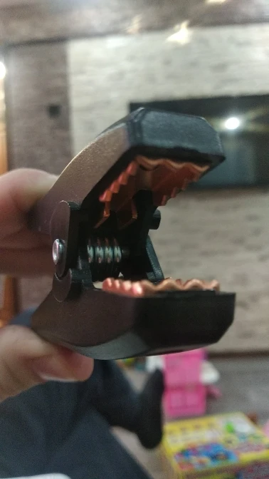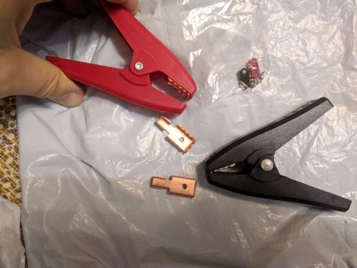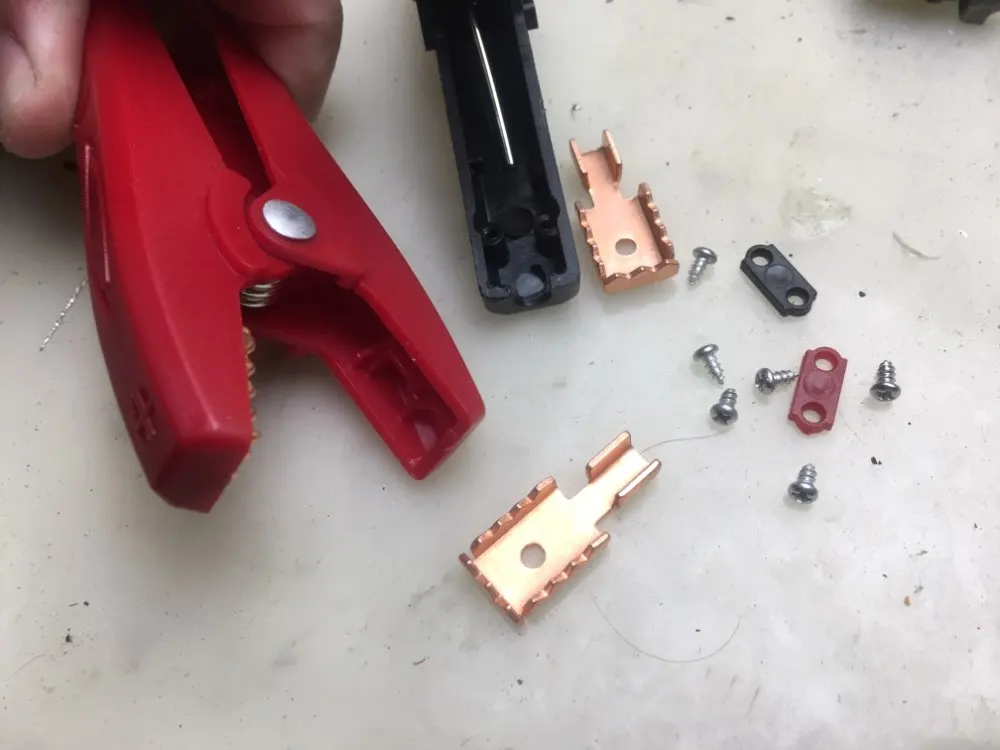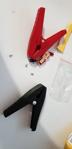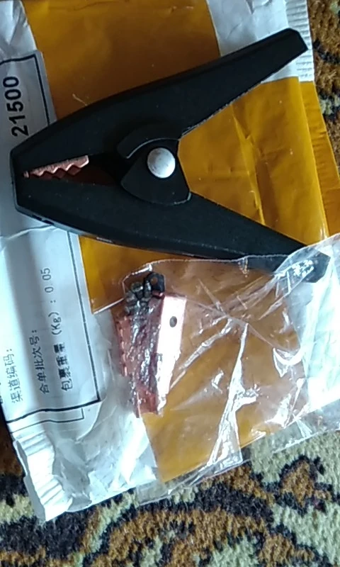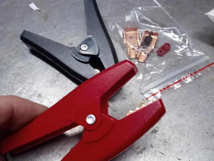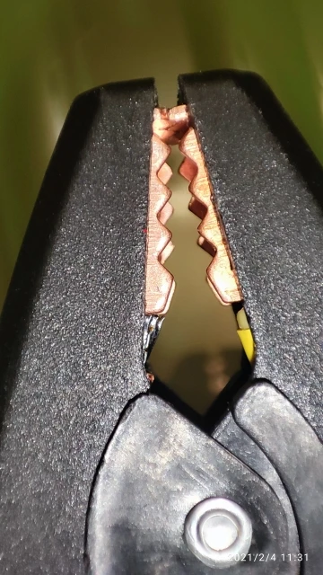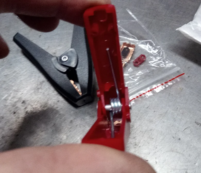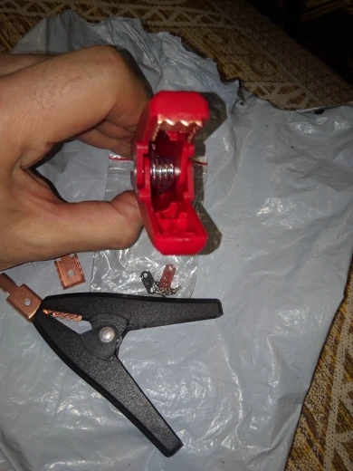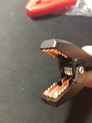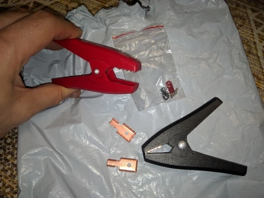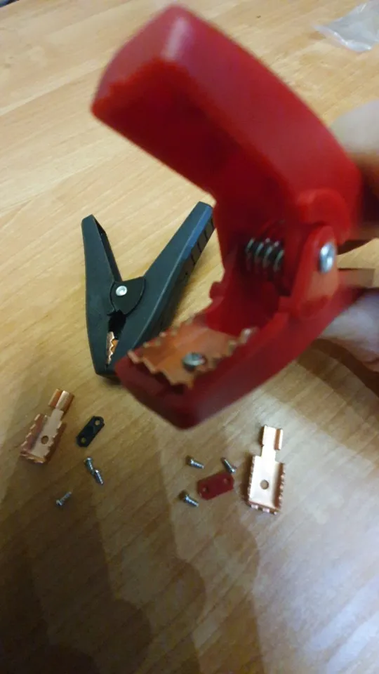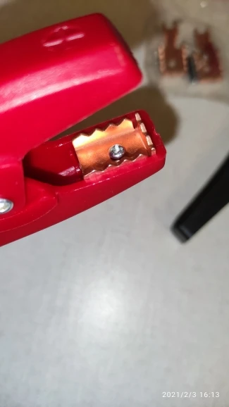 Крокодилы мне понравились - пластиковый корпус достаточно прочен, достаточно компактен, пружина достаточно тугая, палец зажимает не до крови, но почти больно. Под весом провода КГ16 (медный многожильный в резиновой изоляции сечением 16мм²) крокодил не сваливается. Губки разводятся не слишком широко, но достаточно, чтобы зацепиться за клемму. Конечно же, я всё переделал - крокодилы разобрал, кабель оконцевал наконечниками - я их чуть обточил по ширине чтобы в корпус влезали, припаял одну губку, приклепал на него же шинку из оплетки толстого коаксиала и её обжал на вторую губку. А то, как задумал изготовитель, нормального тока не пропустит, и тогда смысла от толстого провода нет. Да, губки магнитятся, похоже, меднёное железо, думаю, не критично