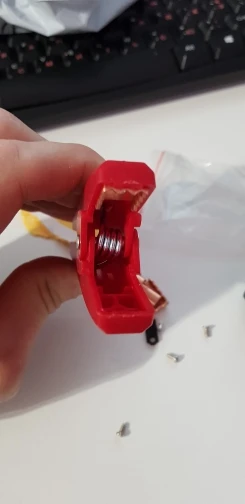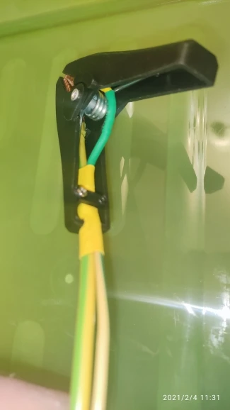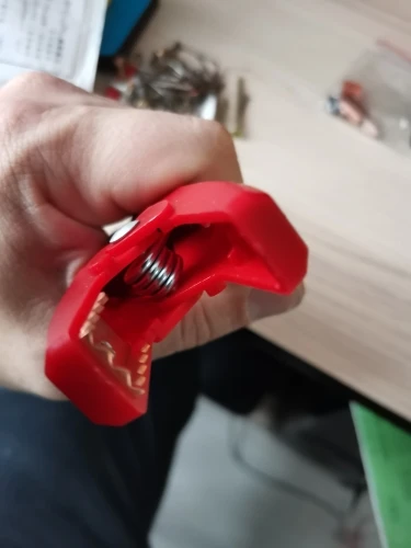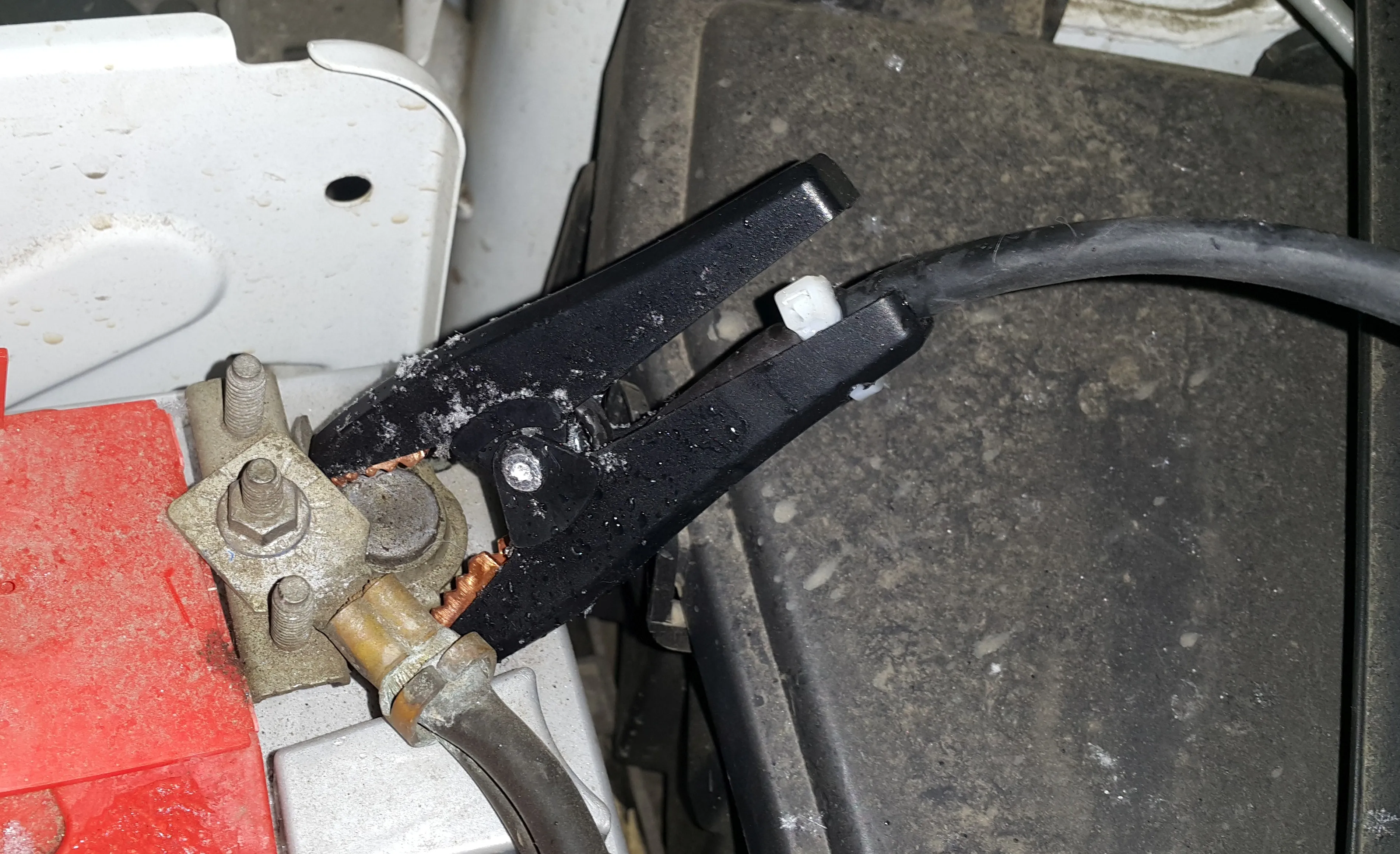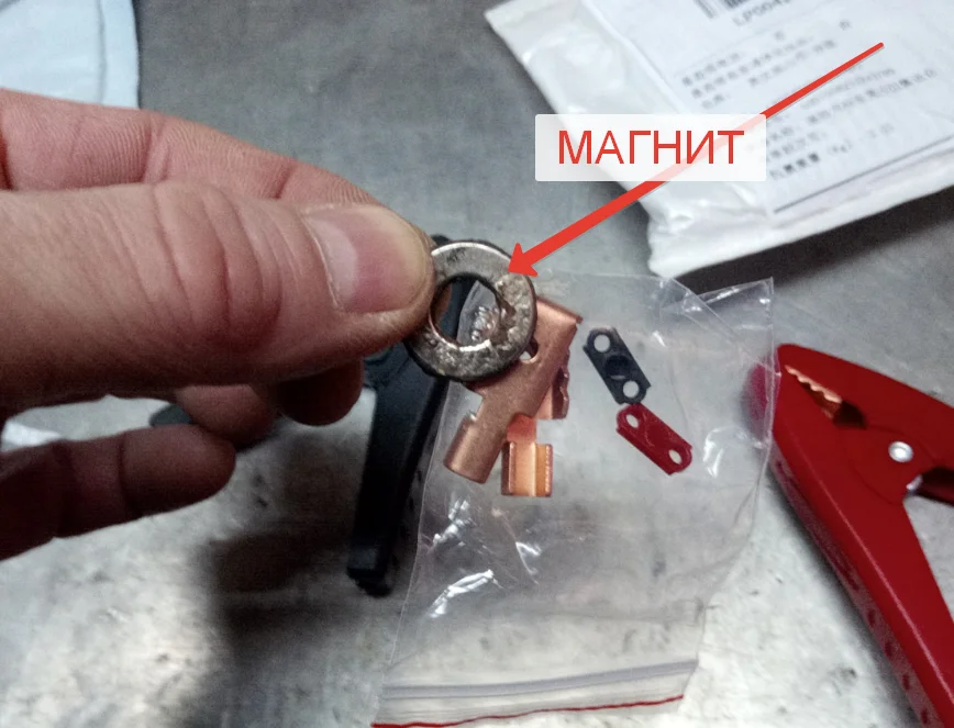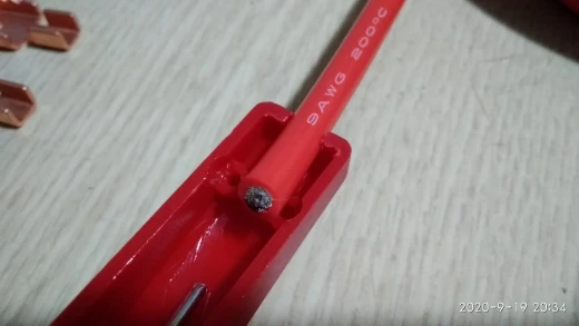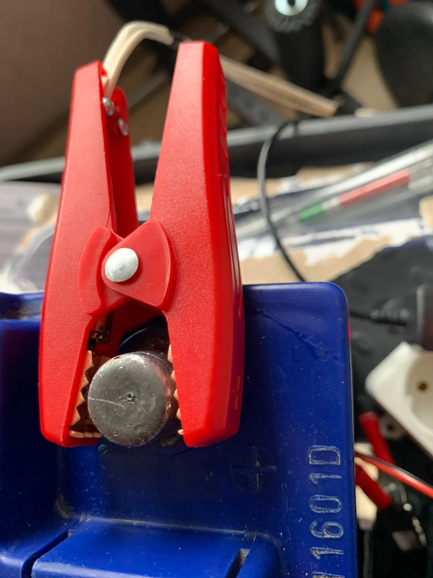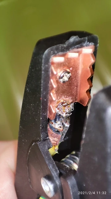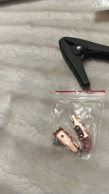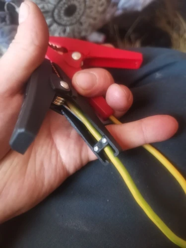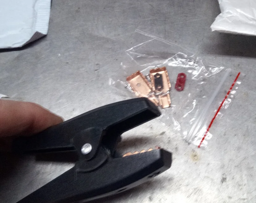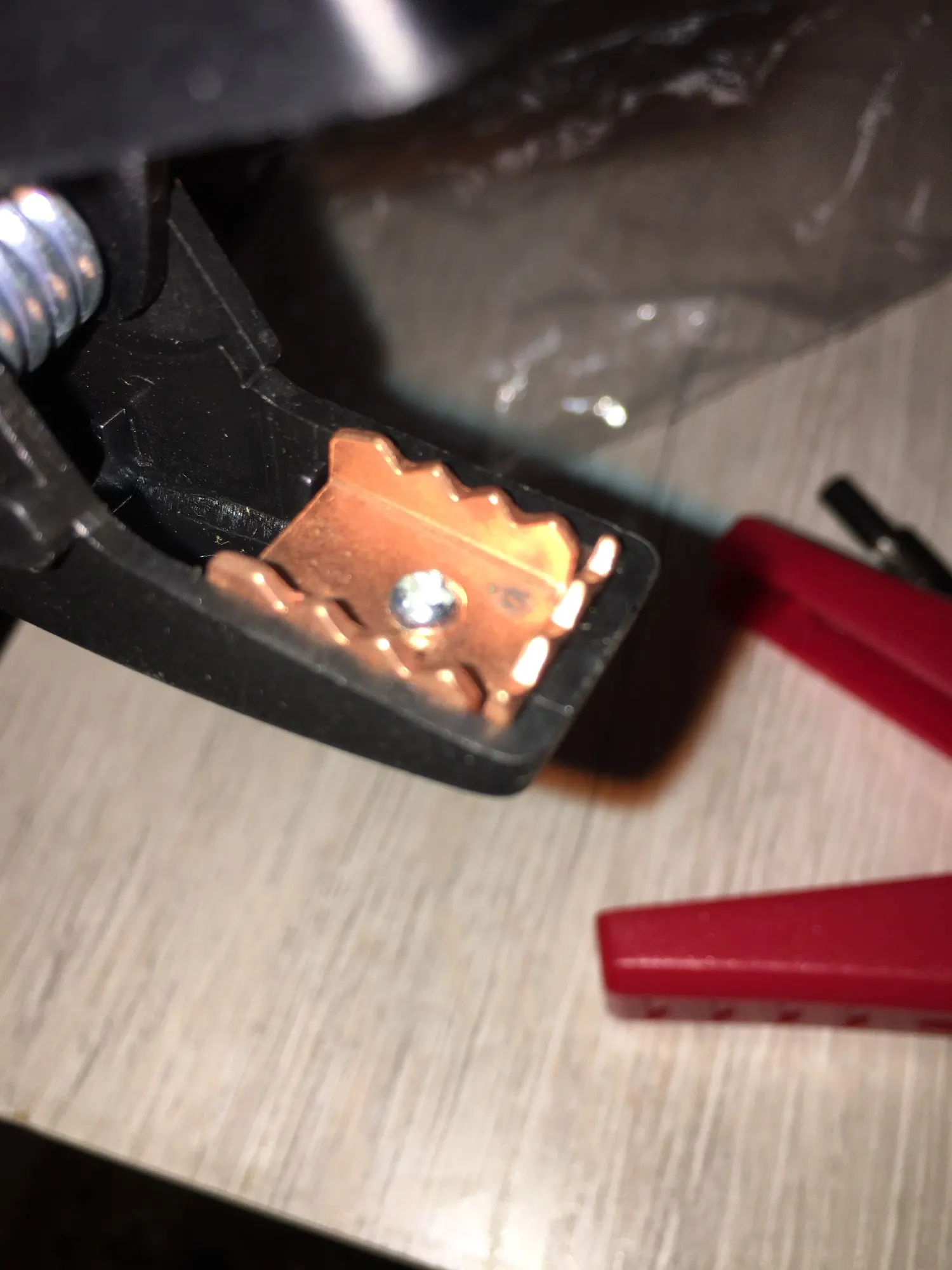 Крокодилы мне понравились - пластиковый корпус достаточно прочен, достаточно компактен, пружина достаточно тугая, палец зажимает не до крови, но почти больно. Под весом провода КГ16 (медный многожильный в резиновой изоляции сечением 16мм²) крокодил не сваливается. Губки разводятся не слишком широко, но достаточно, чтобы зацепиться за клемму. Конечно же, я всё переделал - крокодилы разобрал, кабель оконцевал наконечниками - я их чуть обточил по ширине чтобы в корпус влезали, припаял одну губку, приклепал на него же шинку из оплетки толстого коаксиала и её обжал на вторую губку. А то, как задумал изготовитель, нормального тока не пропустит, и тогда смысла от толстого провода нет. Да, губки магнитятся, похоже, меднёное железо, думаю, не критично
