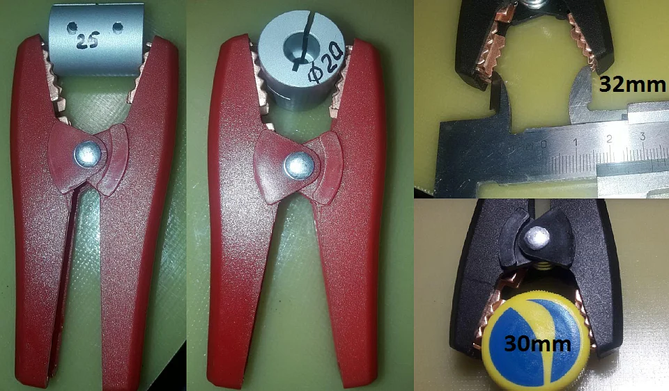 Доставка за две недели, качество нормальное. Корпус полностью пластмасса, соединение алюминиевой заклепкой, пружина жесткая. Один контакт установлен в корпусе, второй (для подключения провода) идет отдельно. Размеры губок видно на фото. Материал губок хорошо магнитится, железо покрытое тонкой медью. Брал для блока питания 24В/20А, со своей задачей справляются, на 100А я бы не использовал. Максимальный размер раскрытия 32мм, уверенно удерживают диаметр 20 мм.