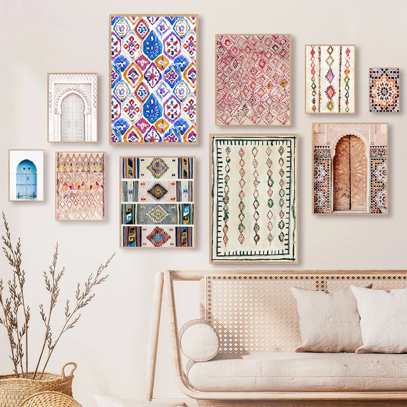 Марокканский ковер, художественные принты, Настенный декор в стиле бохо, эклектический плакат, акварельный розовый эклектический холст, Современная богемная домашняя настенная живопись