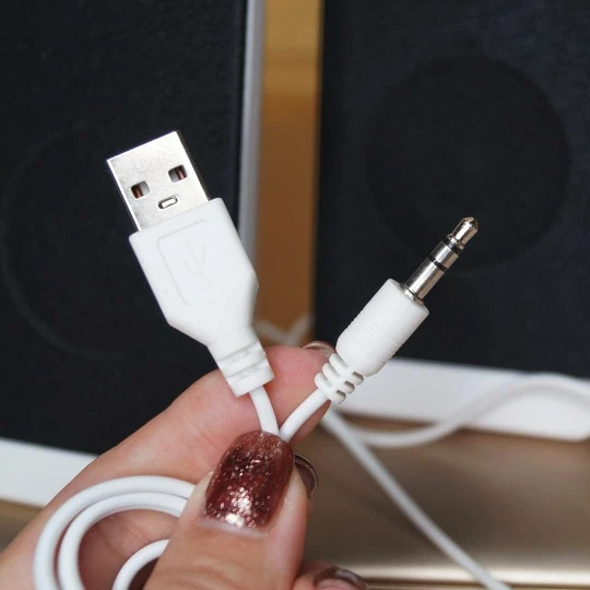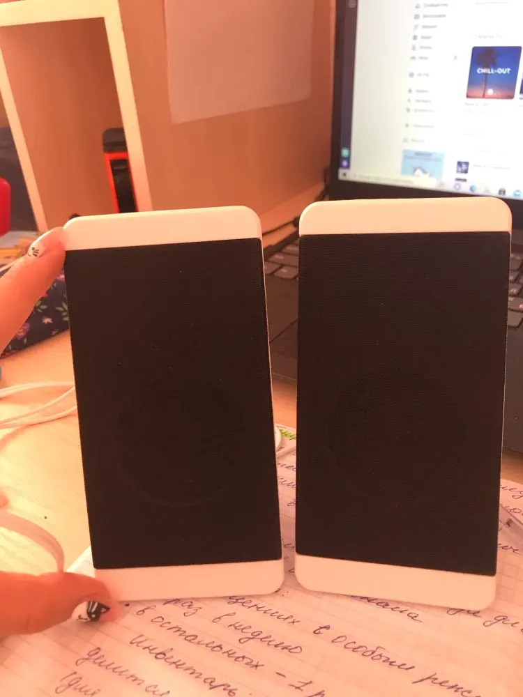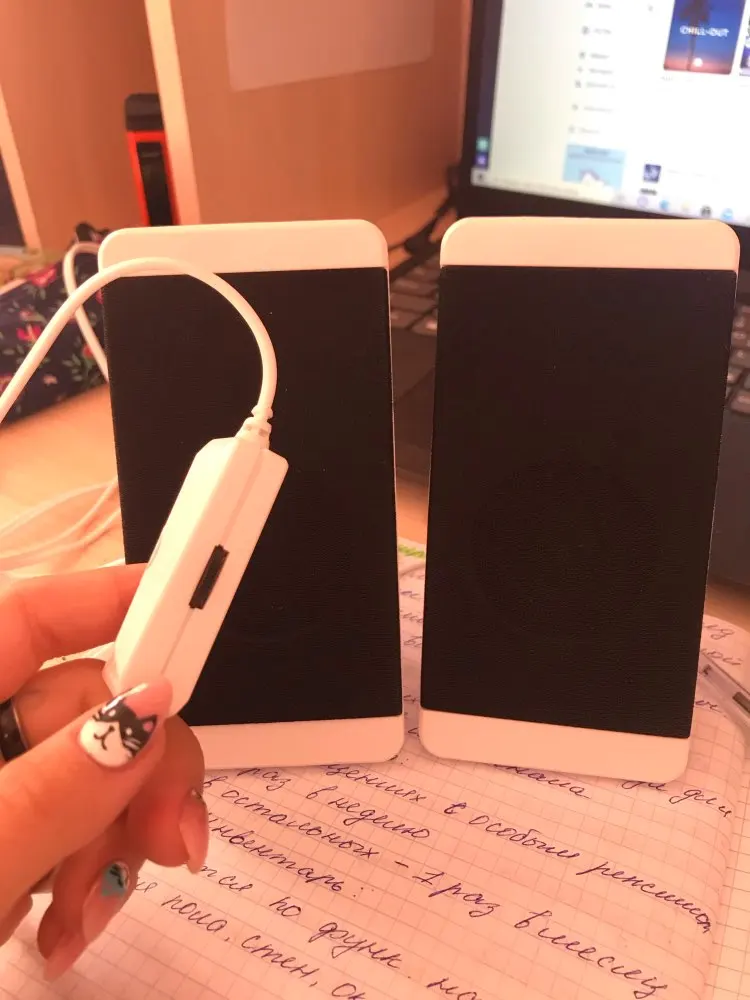 Привлек оригинальный дизайн) Лаконичный, спокойный, нежный. Комплектация заказа: * коробка * колонки 2 шт. * 2 шнура * инструкция. Данный девайс воспроизводит музыку с компьютера. Подсоединяем двойной шнур в разъем USB и разъем AUX и наслаждаемся громкой красивой музыкой. Элегантный белый корпус украшает интерьер и является отличным дополнением для меломанов. Музыку воспроизводит громко! Поверьте, ближайшее окружение будет наслаждаться звуками из данного девайса. Качество звучания отличное. Шикарные колонки в интересном корпусе. Рекомендую!