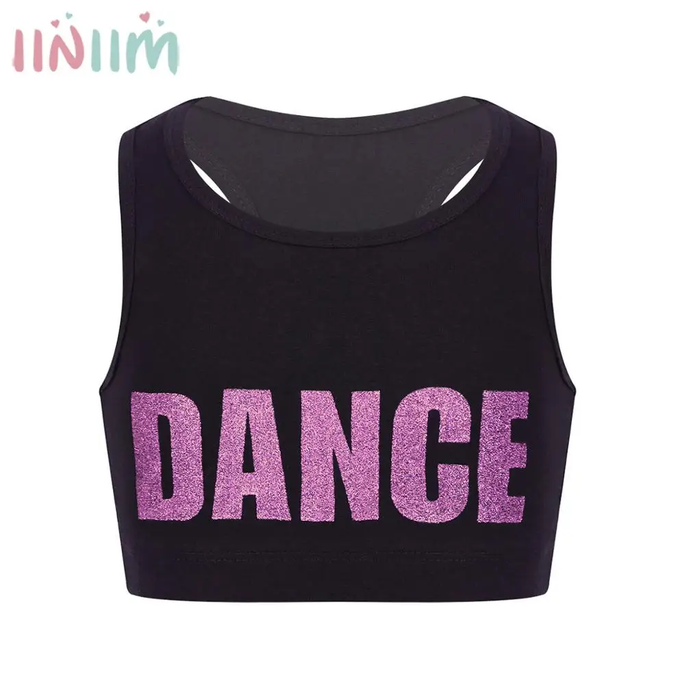 Детский летний жилет iiniim для девочек, топ без рукавов с блестящими буквами, укороченный топ для танцев, танцевальная одежда