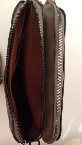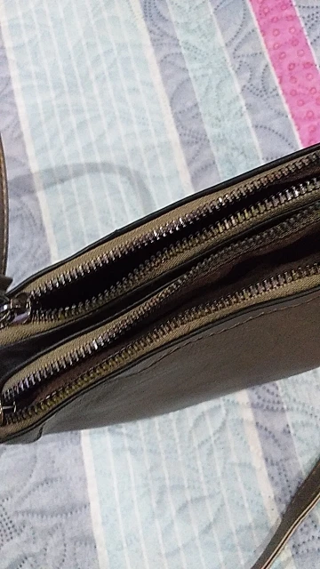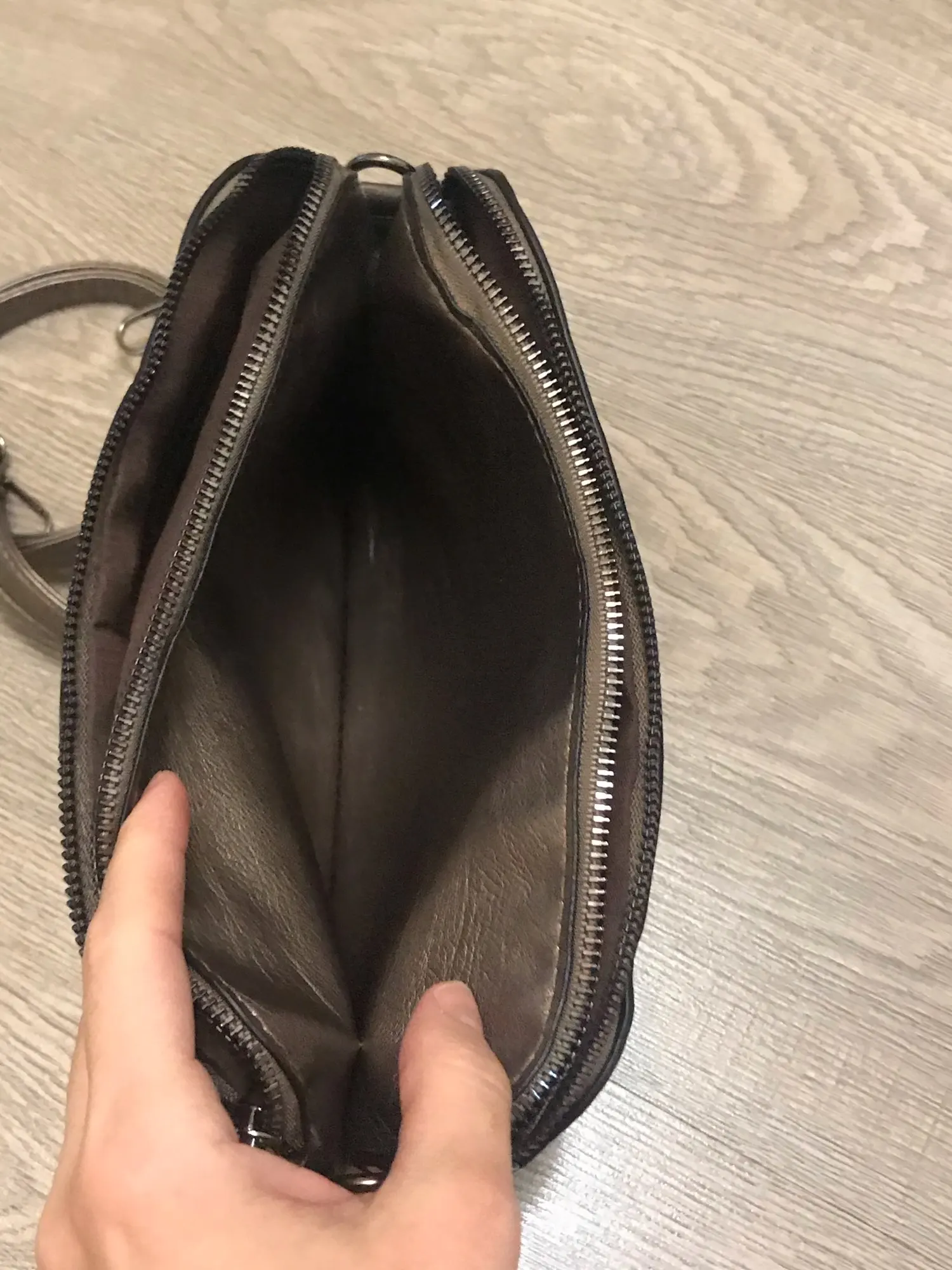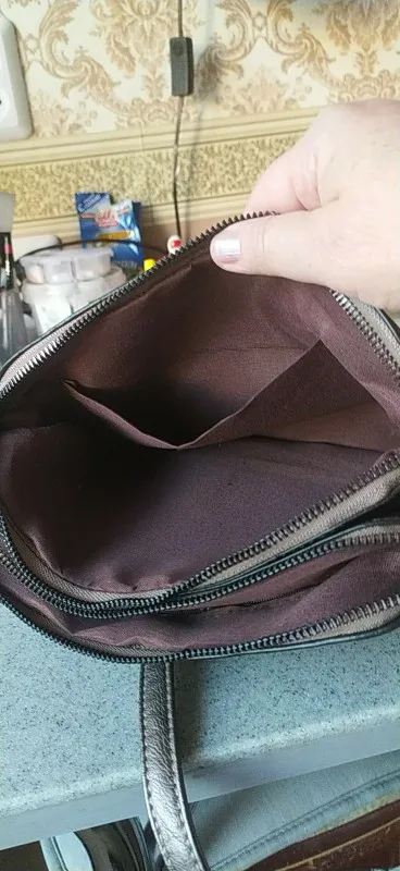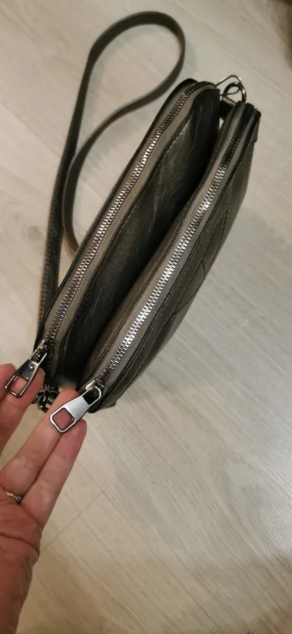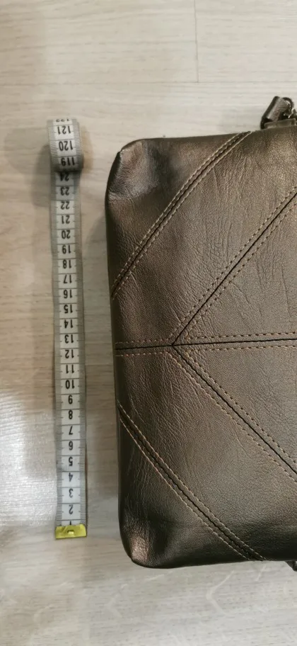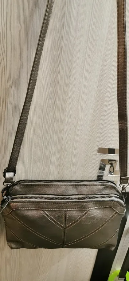 Качественные швы. Цвет бронза (имеет блестящий жемчужный/перламутровый оттенок) Длина ремешка 1.2 м. При моем росте в 1,70м - до начала тазобедренного сустава. Вместительная. 2 отсека на молнии - в каждом - по мини кармашку. Между двух отсеков есть ещё один но без молнии.