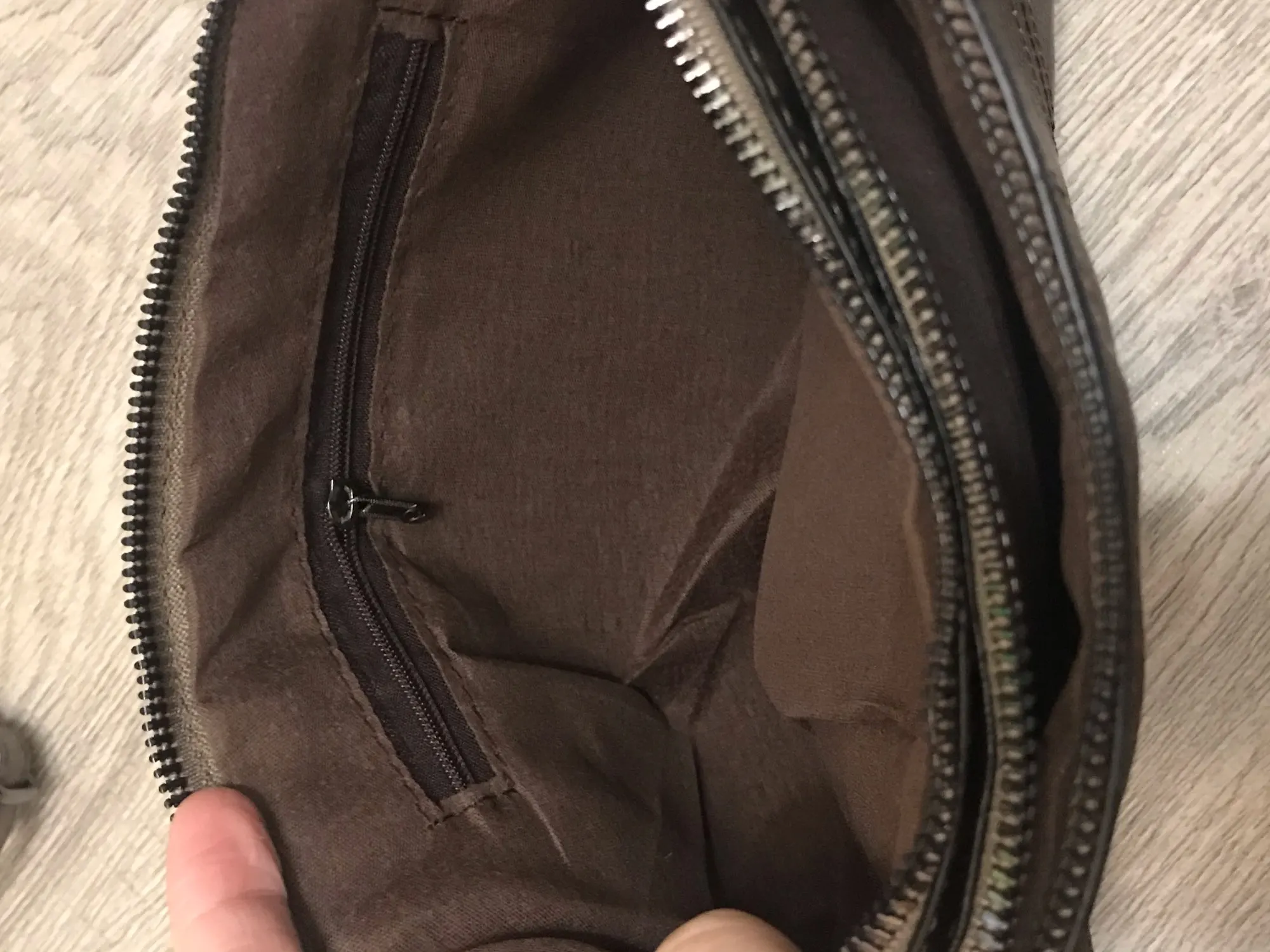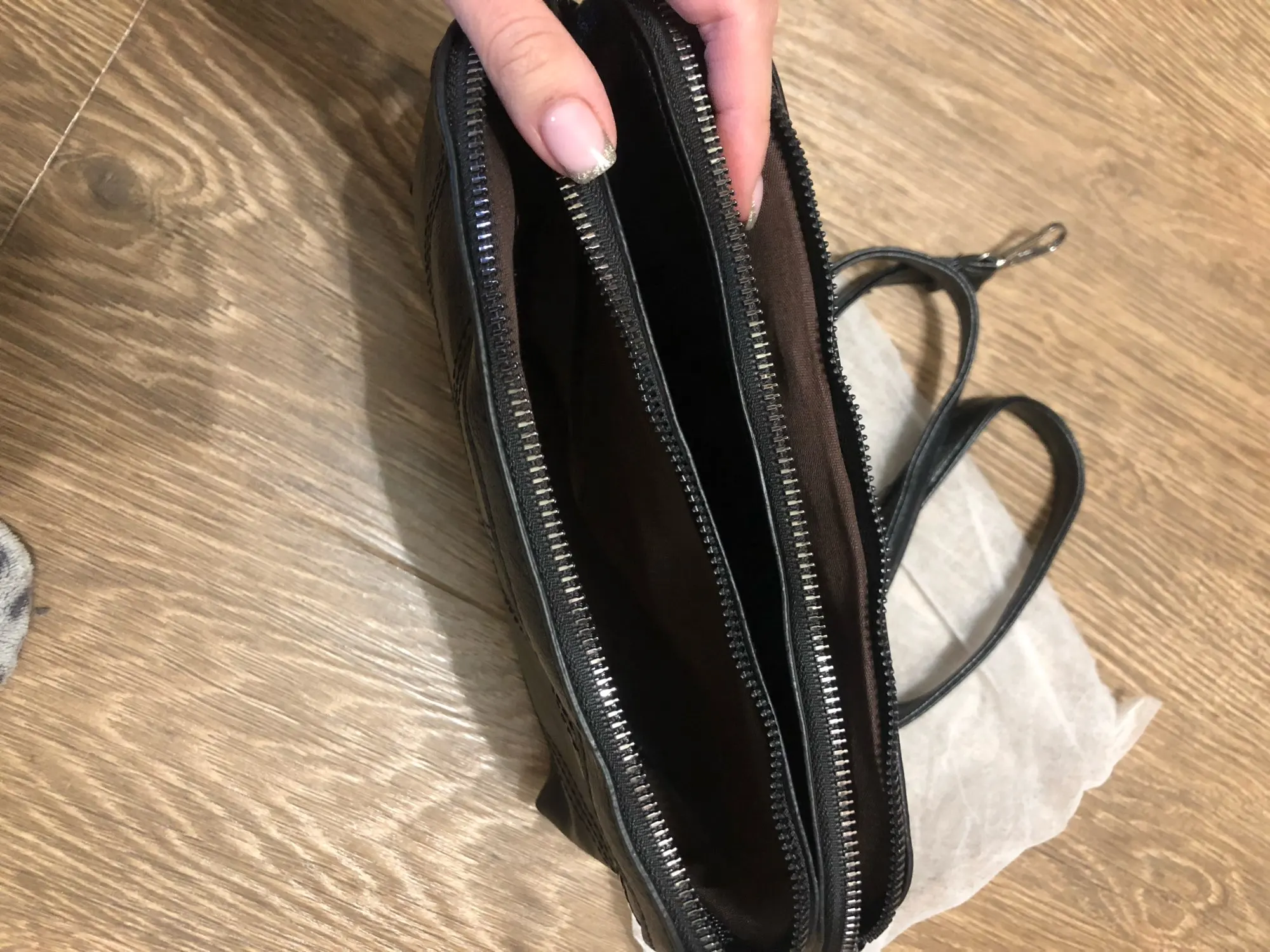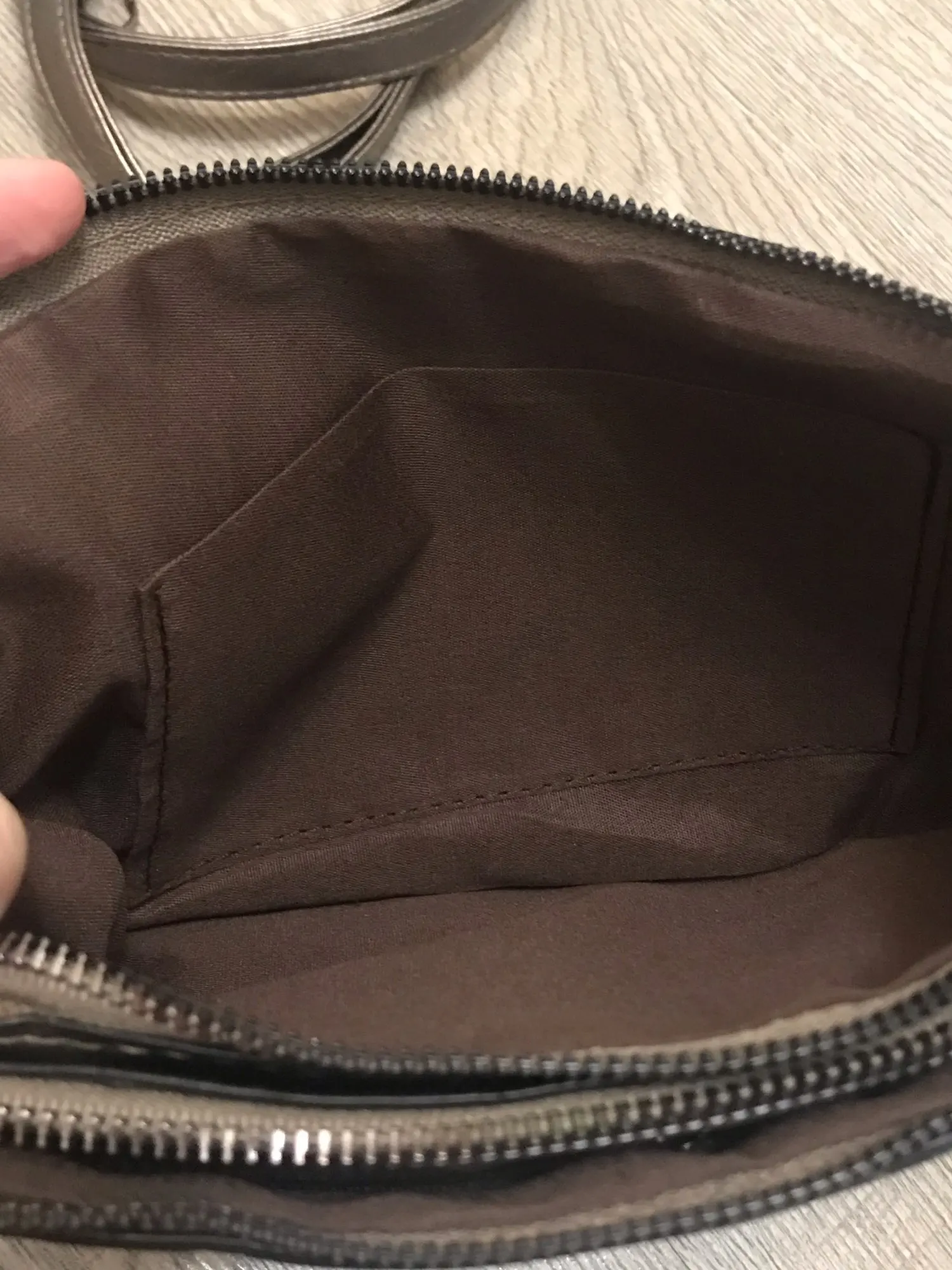 Качественные швы. Цвет бронза (имеет блестящий жемчужный/перламутровый оттенок) Длина ремешка 1.2 м. При моем росте в 1,70м - до начала тазобедренного сустава. Вместительная. 2 отсека на молнии - в каждом - по мини кармашку. Между двух отсеков есть ещё один но без молнии.