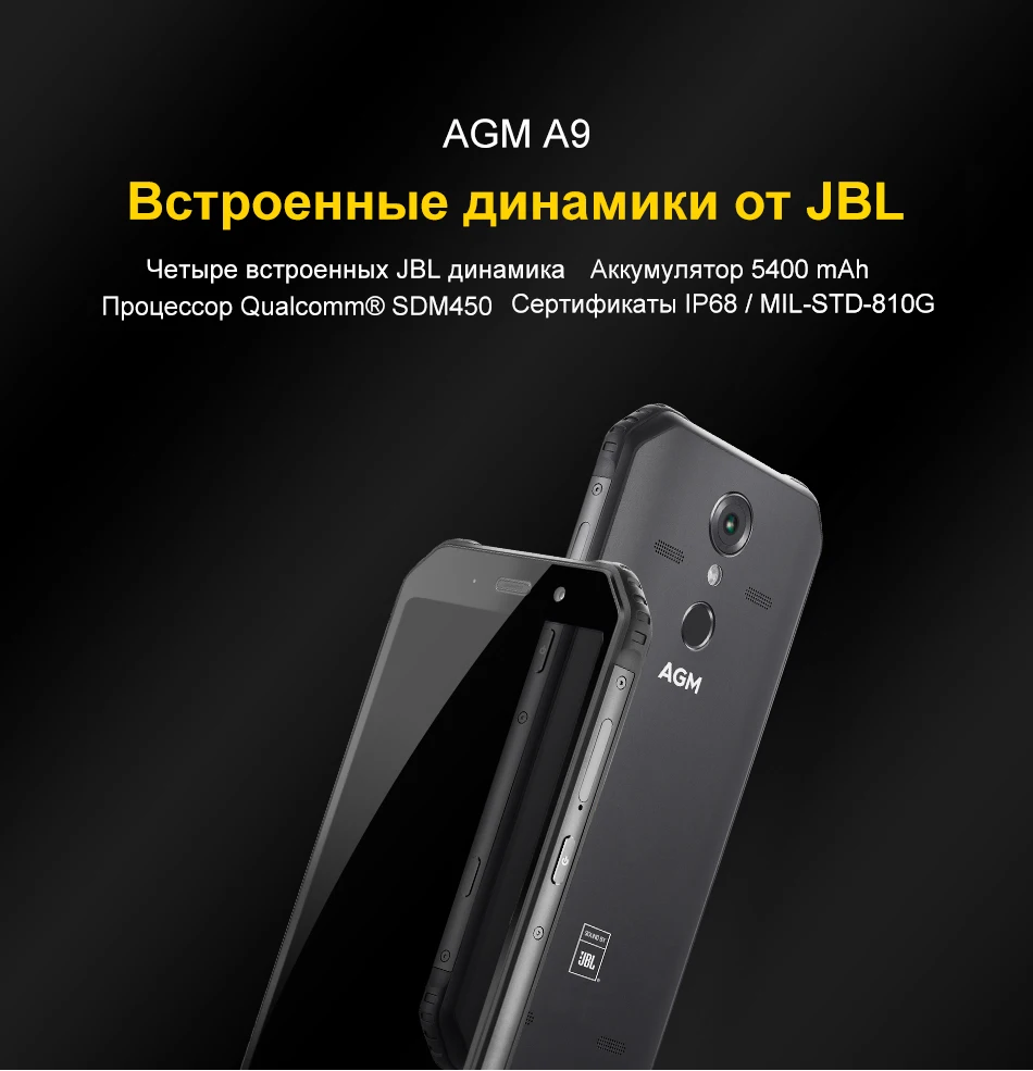 Водонепроницаемый смартфон AGM A9 JBL, официальная версия совместный бренд 5,99 дюйма, FHD, 4G, 64 Гб, Android 8.1, прочный телефон, аккумулятор 5400 мАч, IP68, Quad-Box колонки