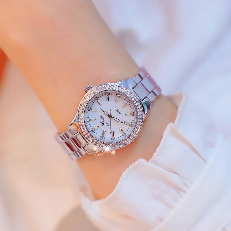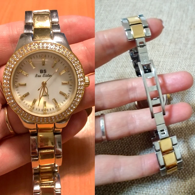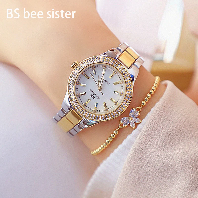 Часы наручные BS женские кварцевые, брендовые модные золотистые, с кристаллами, под платье из нержавеющей стали, Прямая поставка