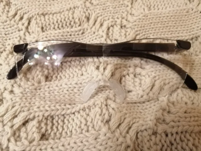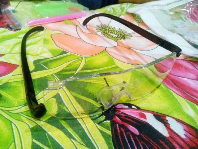 Очки соответствуют описанию. увеличение х1,5 крат. не много, но для работы с мелкими деталями сводятся. Вес небольшой, силикон на переносице. Комфортное расстояние до рассматриваемого предмета: 20-30 см. Получение на почте. продавца рекомендую.