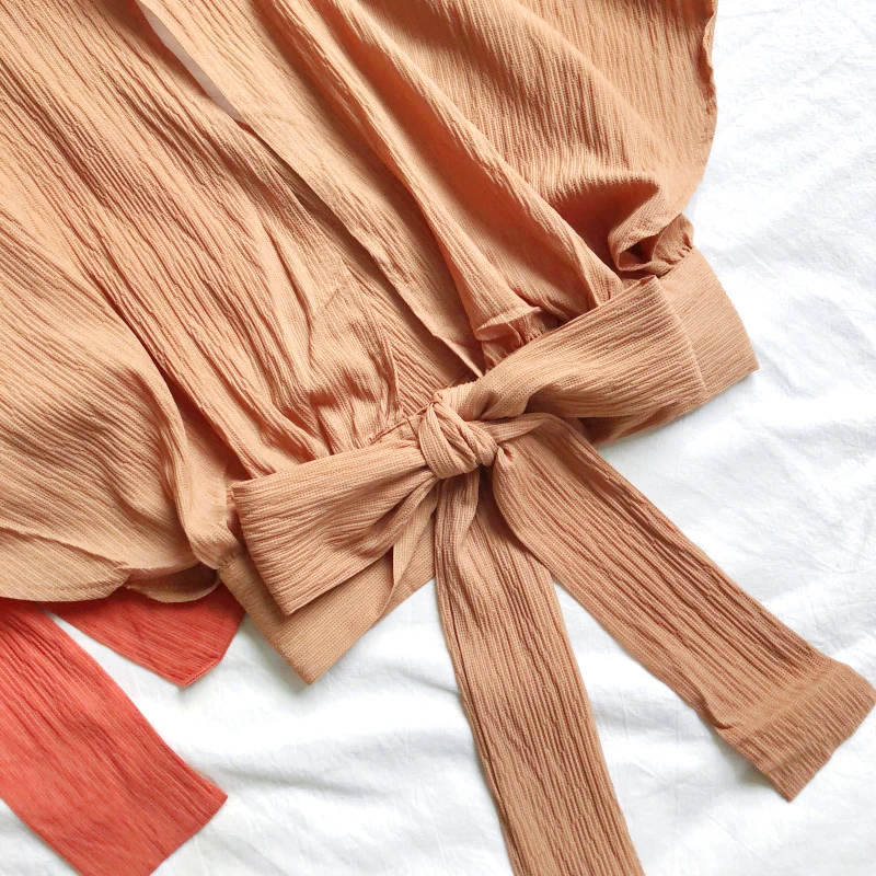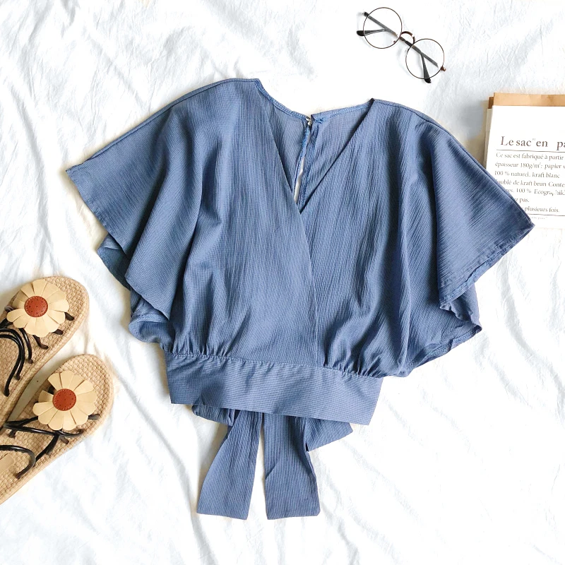 Женская блузка с рукавами летучая мышь и V-образным вырезом, Элегантная короткая облегающая блузка с завязкой и бантом, пикантный пуловер с завышенной талией на лето