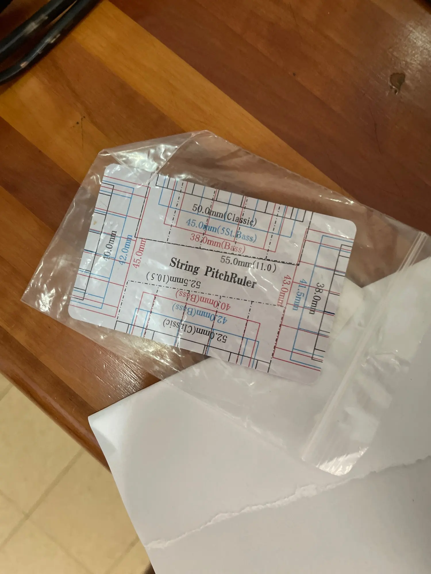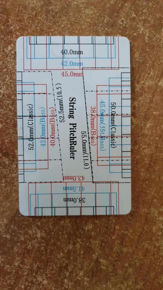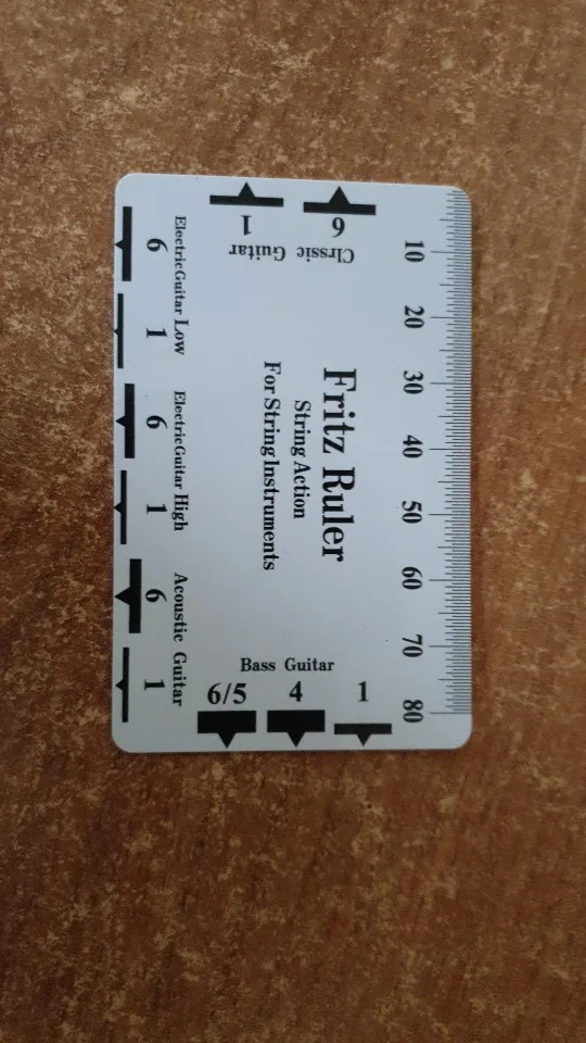 Пластиковая карточка стандартного размера .Печать качественная . Посылка дошла за 13 дней. С одной стороны высота первой и шестой струны для разных типов гитар , с другой лекала для проверки и разметки расположения струн на верхнем порожке для разных размеров грифа .