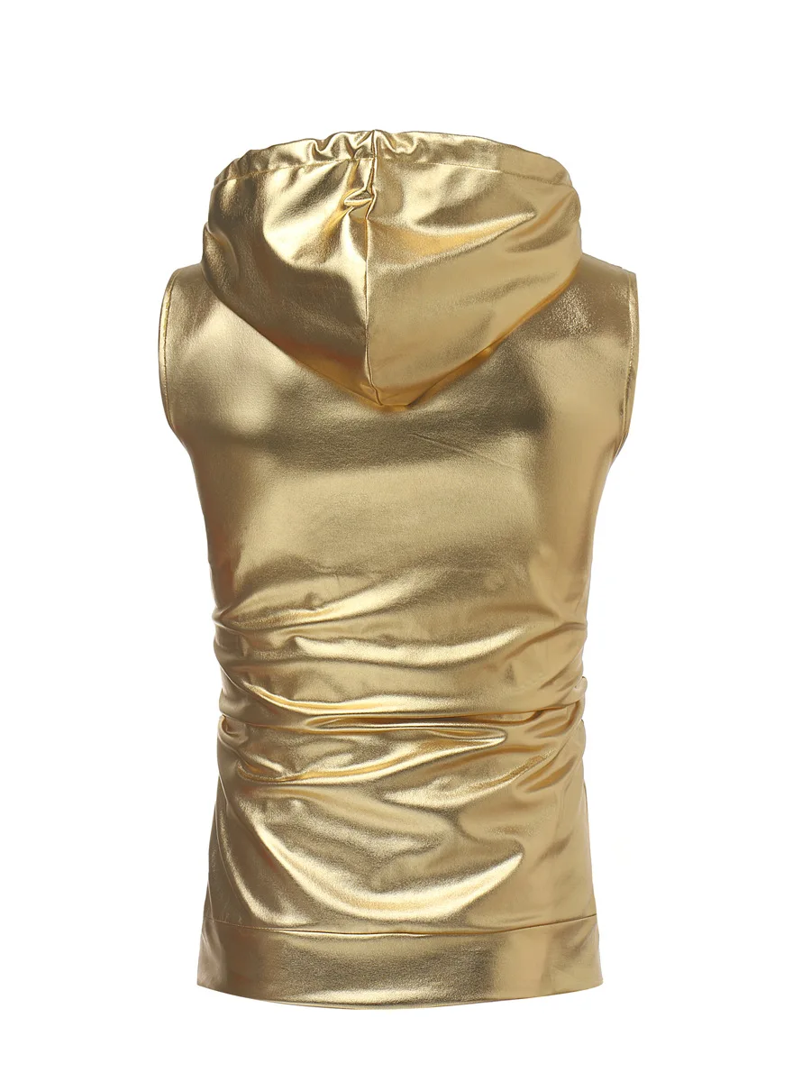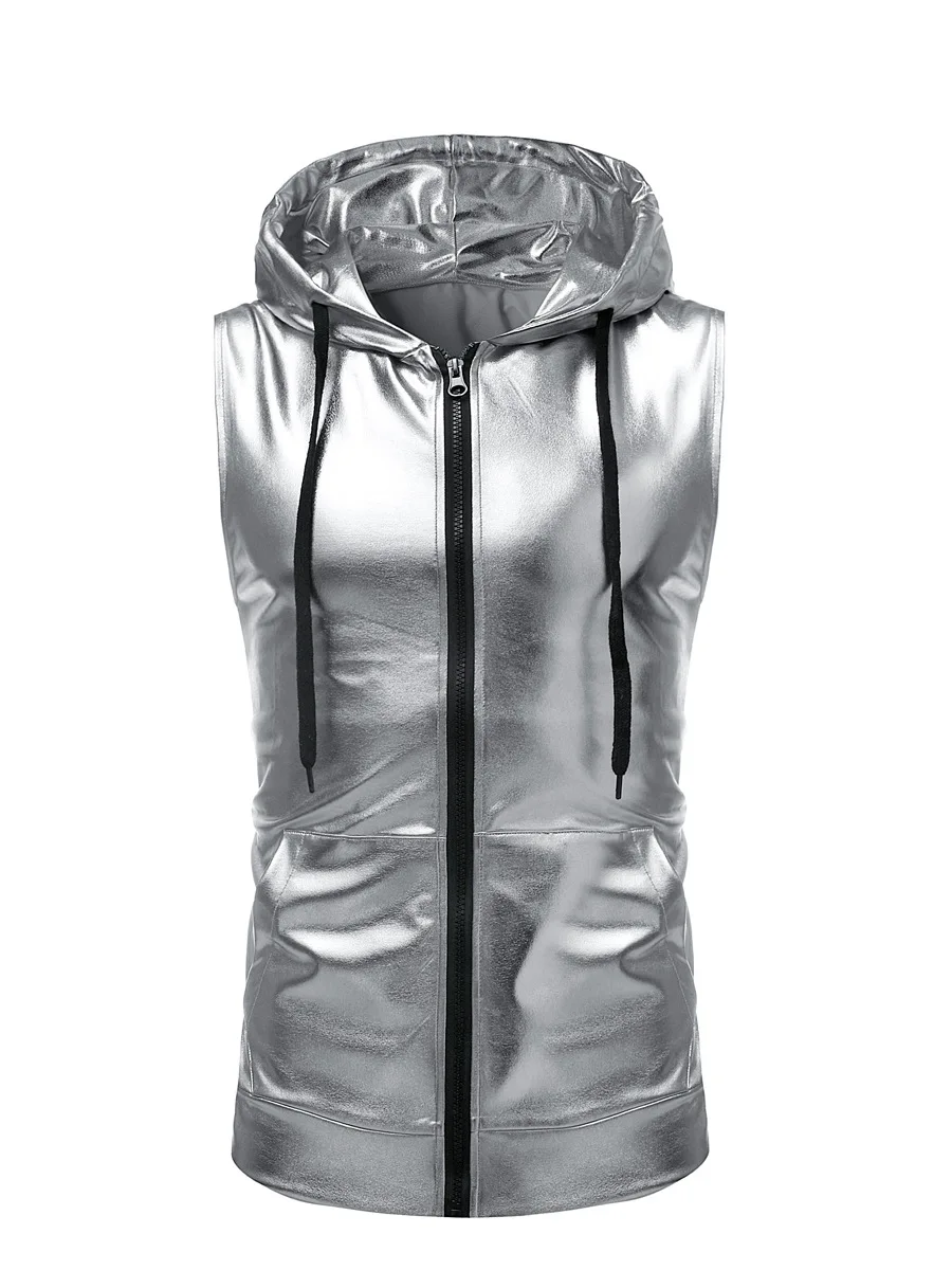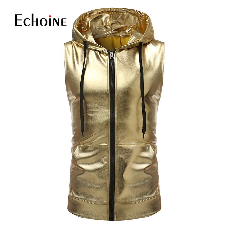 Жилет мужской с капюшоном, повседневный жилет без рукавов, золотисто-серебристый, однотонный, для клуба и фитнеса, уличная одежда, Западный плащ, весна-осень