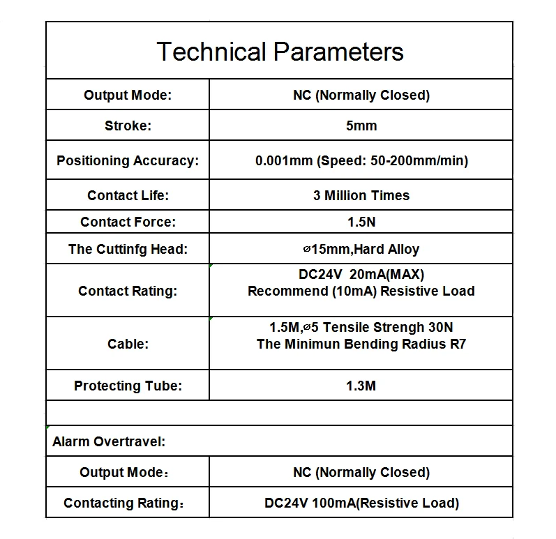 Режим выхода: NC (обычно Закрытый )Предоплата: почти 0Ход: 5 ммТочность повторного позиционирования: 0,001 мм (скорость работы: 50-200 мм/мин)Срок службы: 3000000 раз.Сила контакта: 1,5 НВнешняя оболочка: шлифовальный 4S.Защита: IP67.Режущая головка: диаметр 15 мм, твердосплавный.Номинальная мощность: 20 мА (макс.) DC24V рекомендуемое значение (10 мА) резистивная нагрузкаКабель: 1,6 м 4-секционный Предел прочности при растяжении 30N минимальный радиус изгиба R7Защитная трубка: 1 м (минимальный радиус изгиба R25)Ультра дорожный будильник:Превышение спецификаций: NC (нормально закрытый), сигнал расстояния около 5 ммНоминальная мощность: DC24V 20 мА (макс.) 10 мА (резистивная нагрузка).