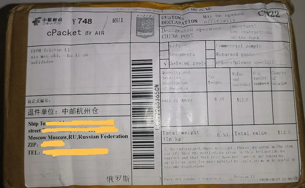Доставка в Москву заняла всего 12 дней. Заказывал 2 шт. разных кусачек и 2 разных пилки. Упаковано в достаточно плотную общую коробку (см. фото). Внутри ничего не помялось. Фирменные коробки полностью целы, годятся даже для подарка. Все изделия отличного качества! Продавец ответственный. Рекомендую. Можно смело у него покупать.