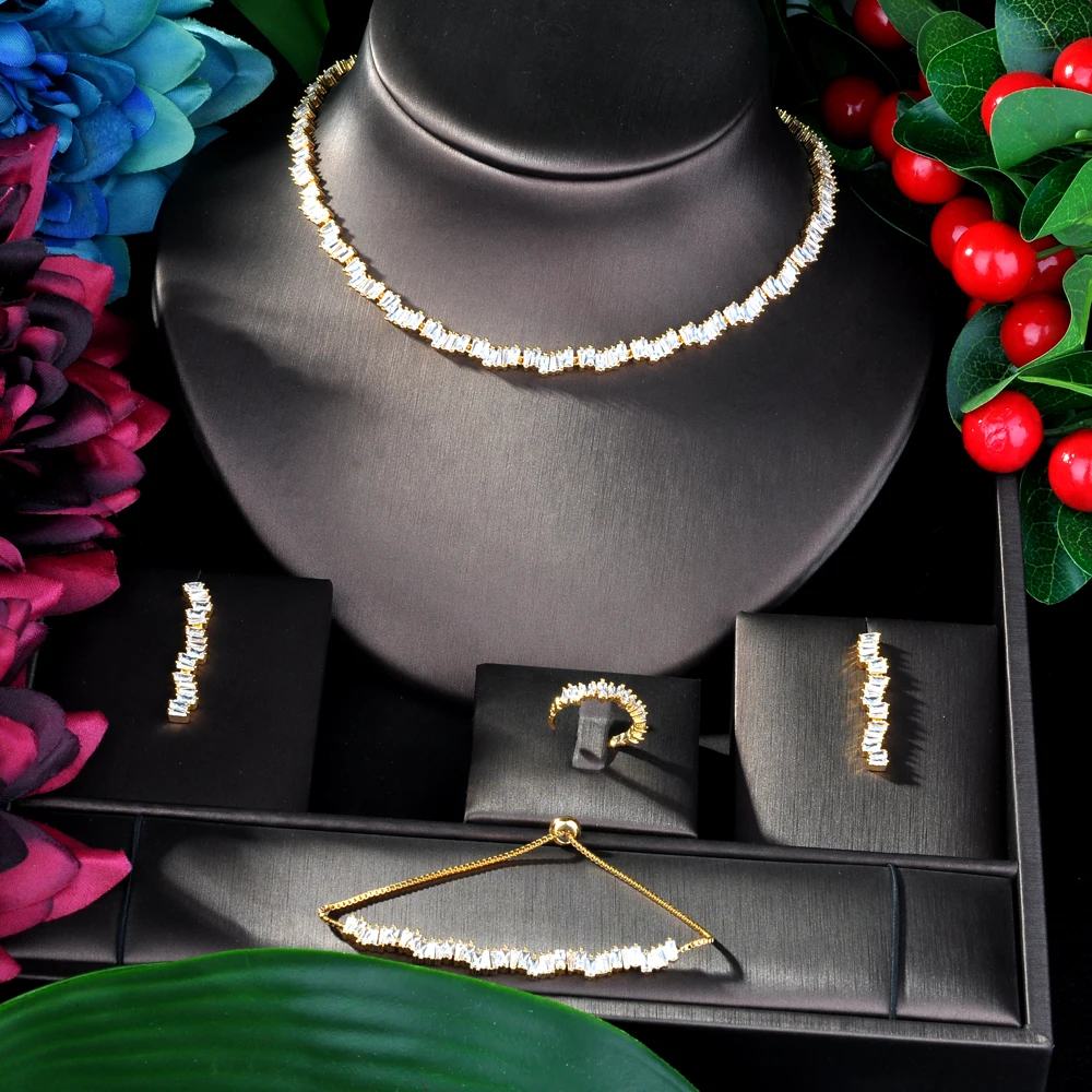 HIBRIDE роскошные 4 шт ожерелье и серьги набор багет циркония чокер...