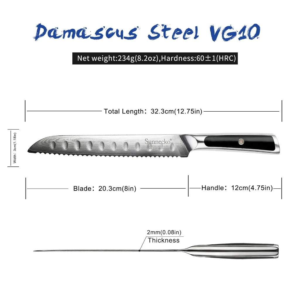 Нож для хлеба SUNNECKO VG10, японские кухонные ножи из дамасской стали, острые лезвия из G10, рукоятка для резки завтрака, 8 дюймов, подарочная коробка