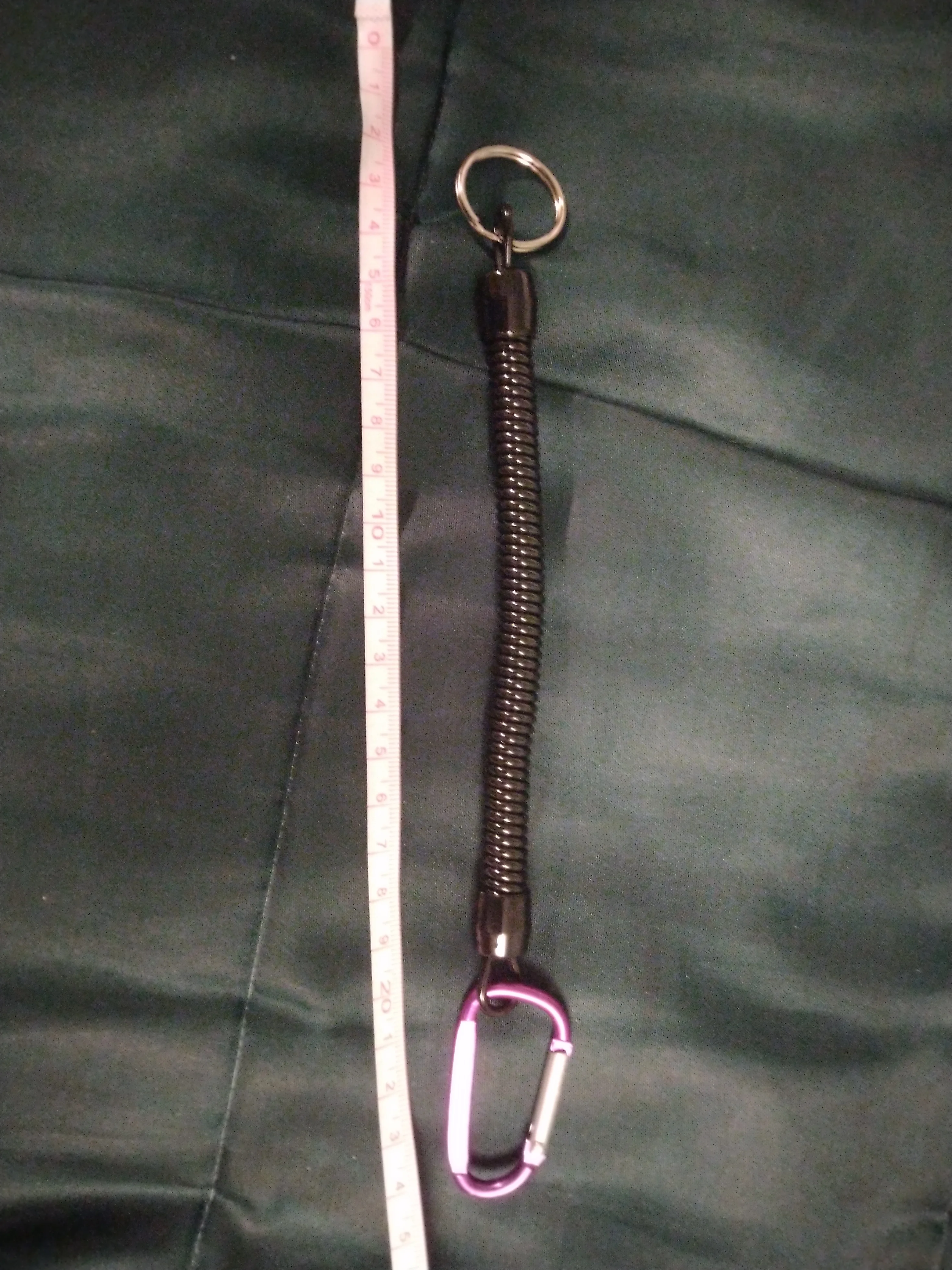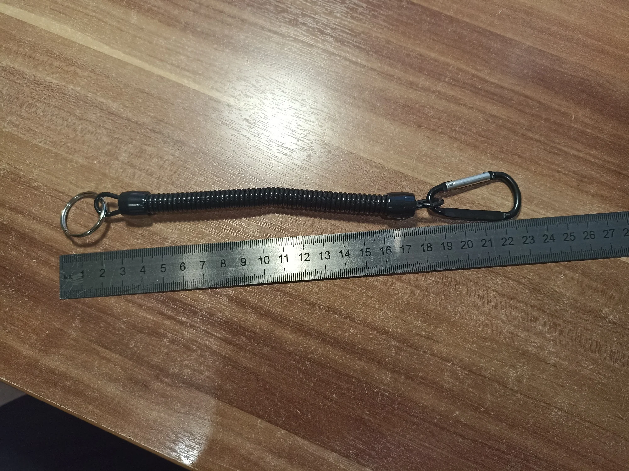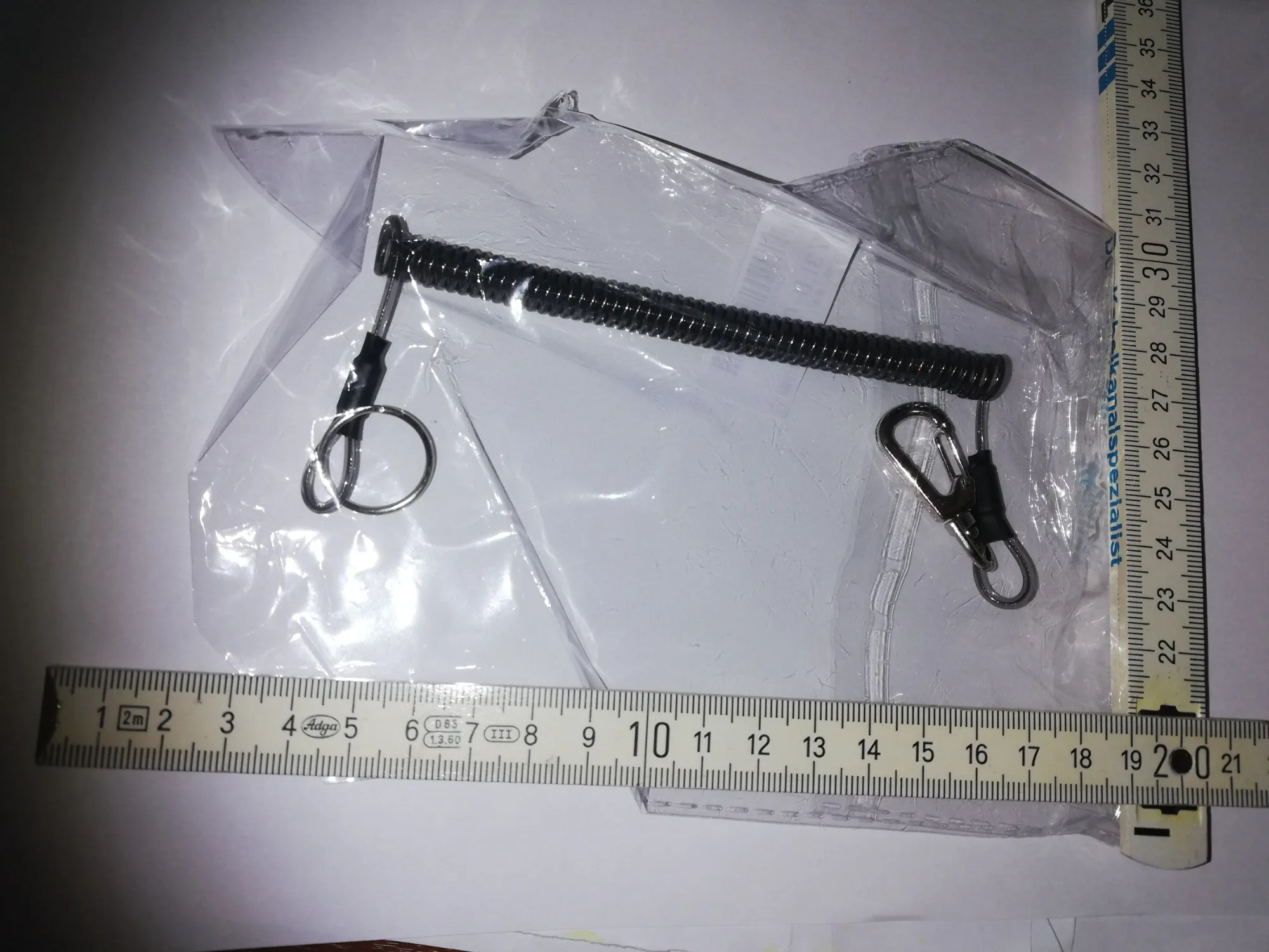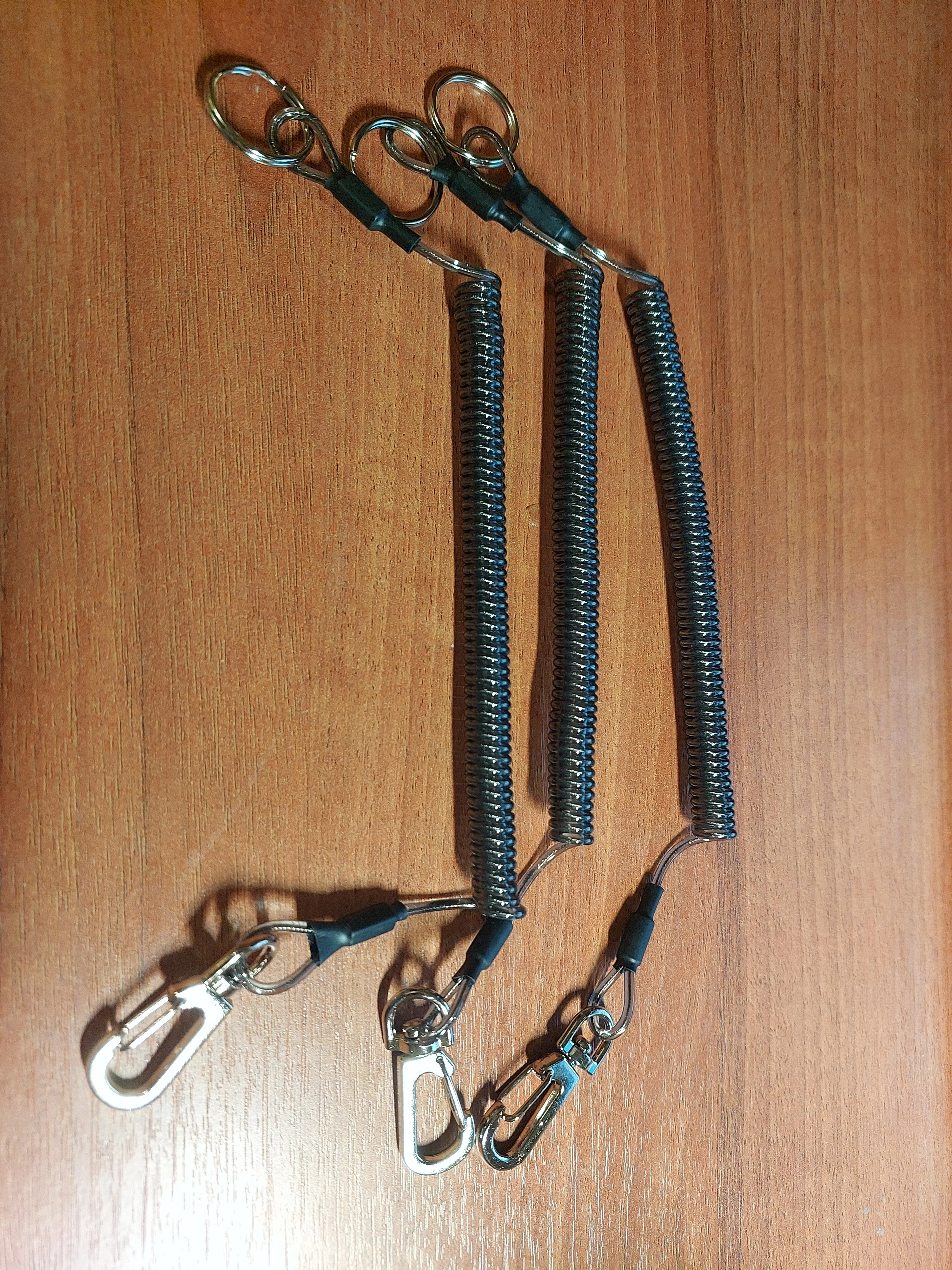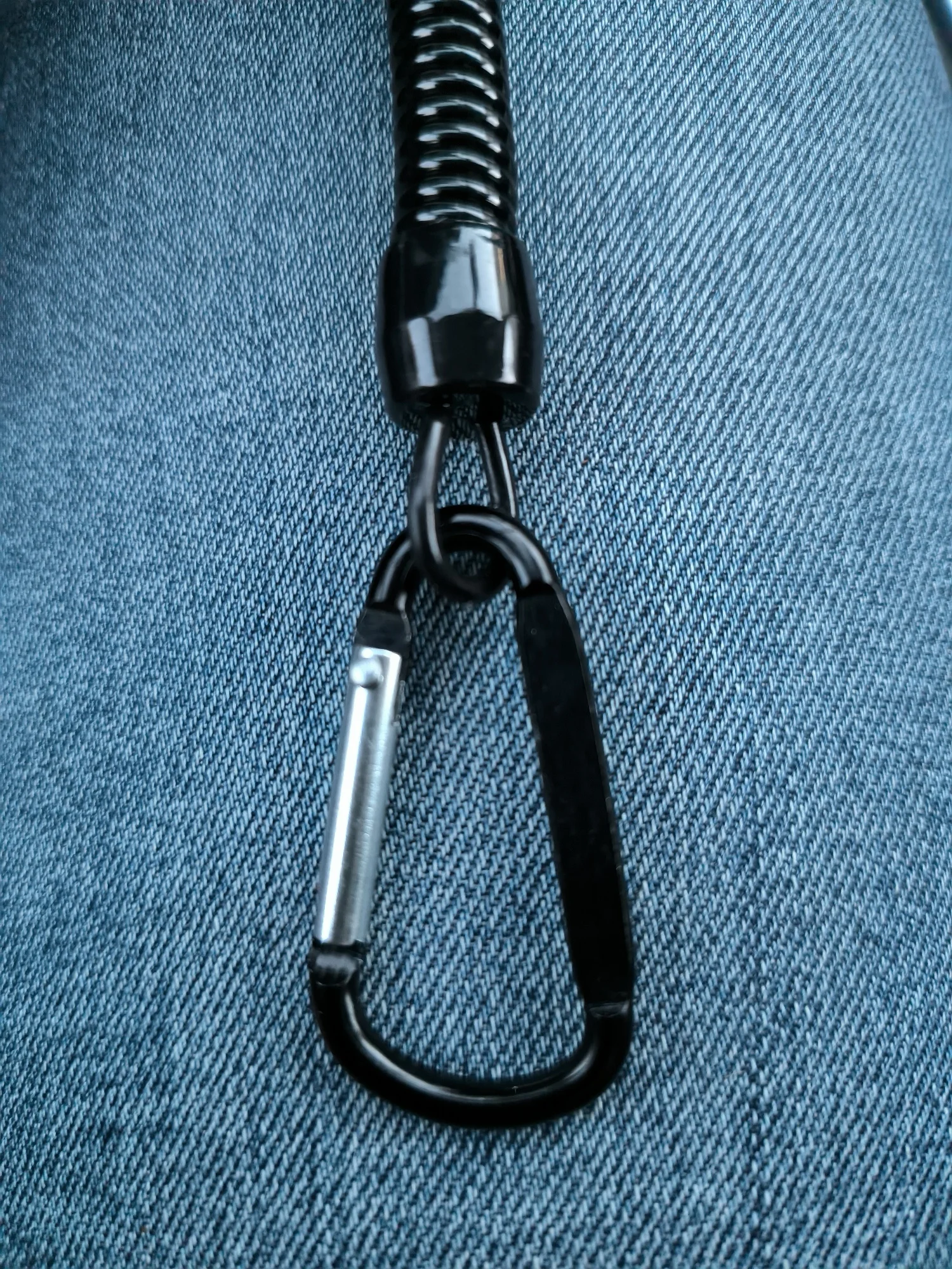 Хороший тренчик! Размер идеален для ножа. В свернувшемся состоянии длина 15 см, в растянутом-почти 80. Цельная полимерная спираль, концы которой сделаны пятлями и залиты в конечные колпачки.