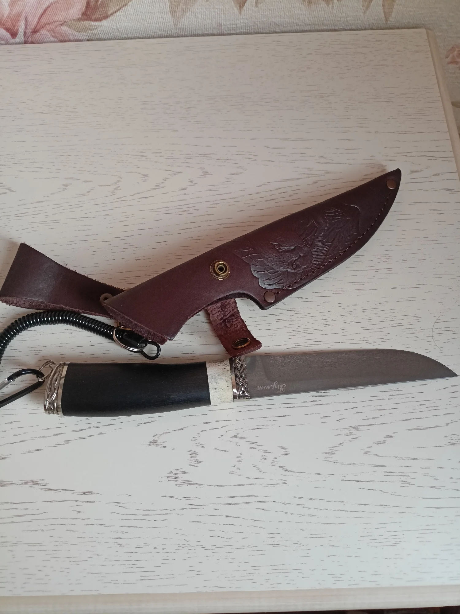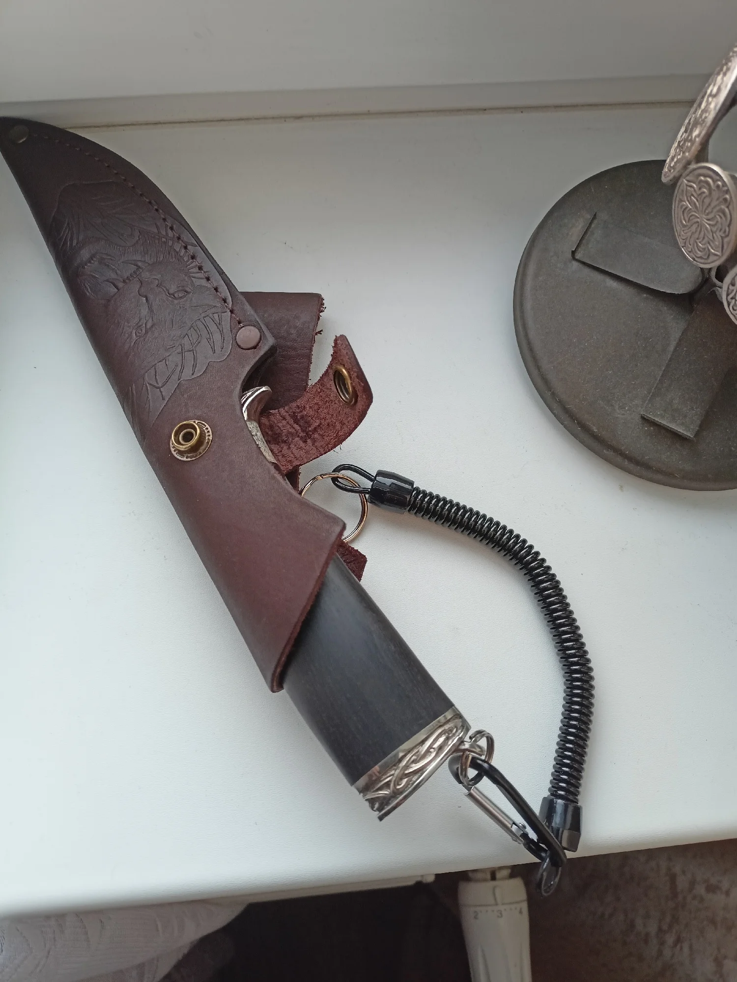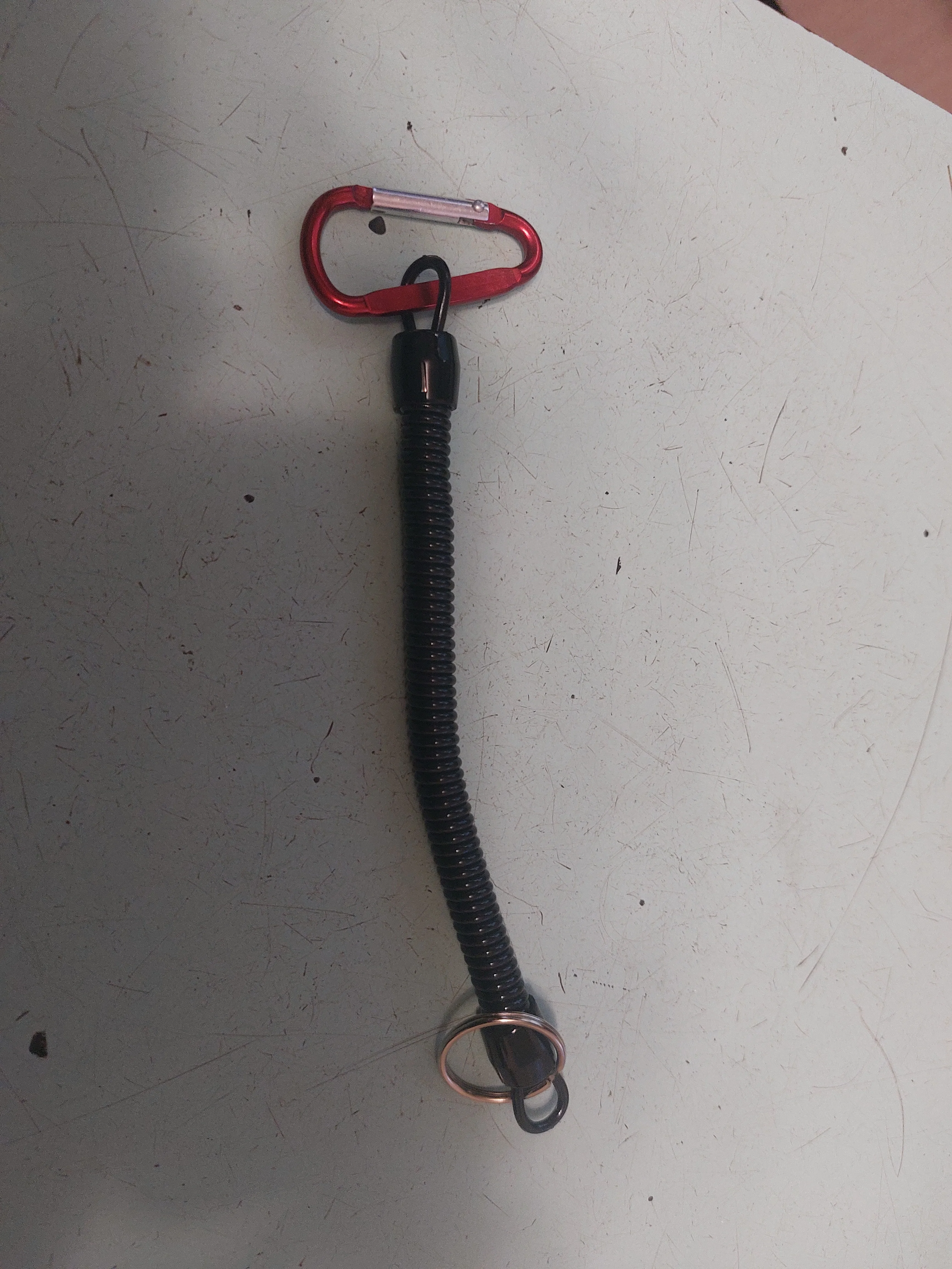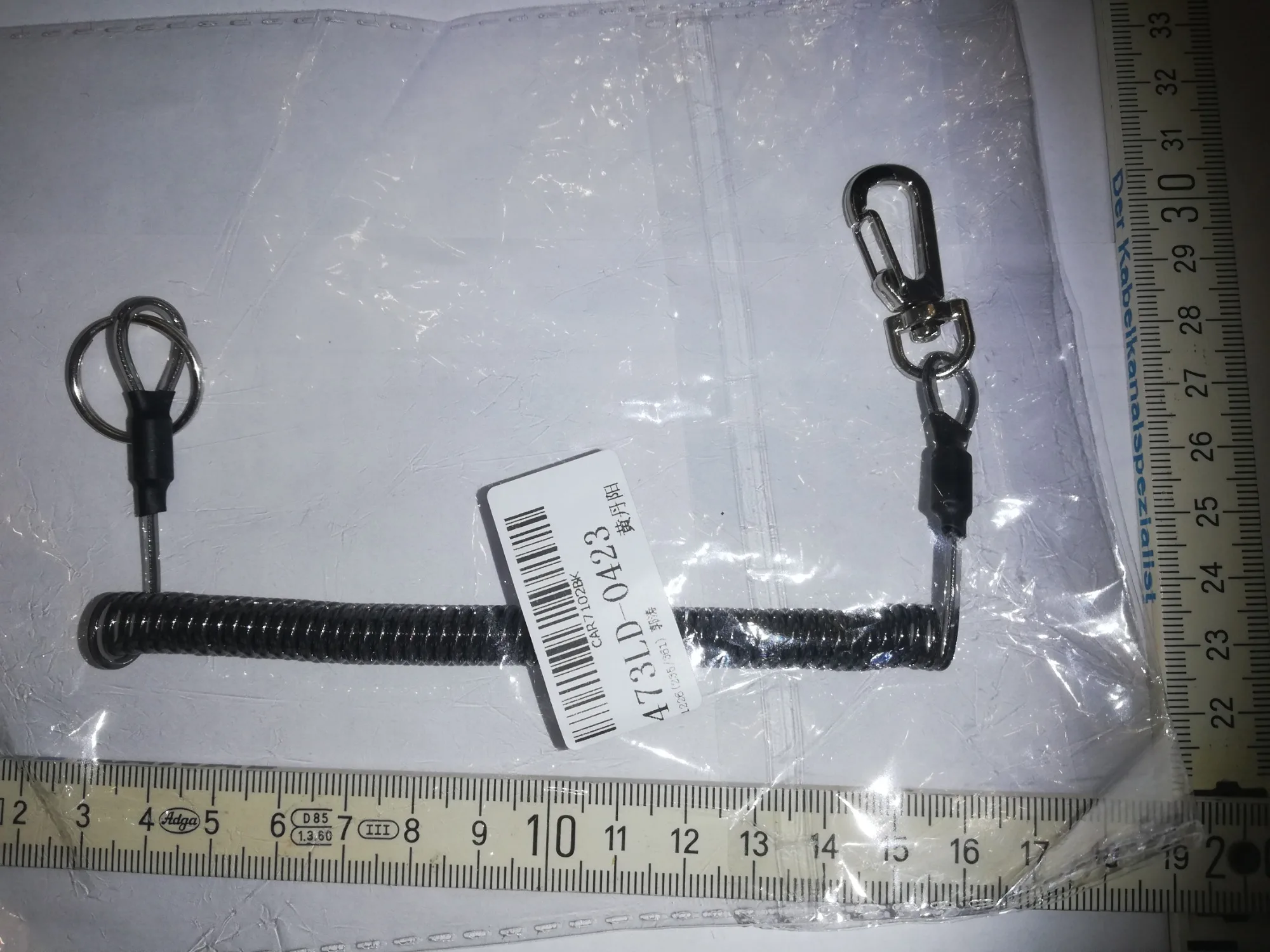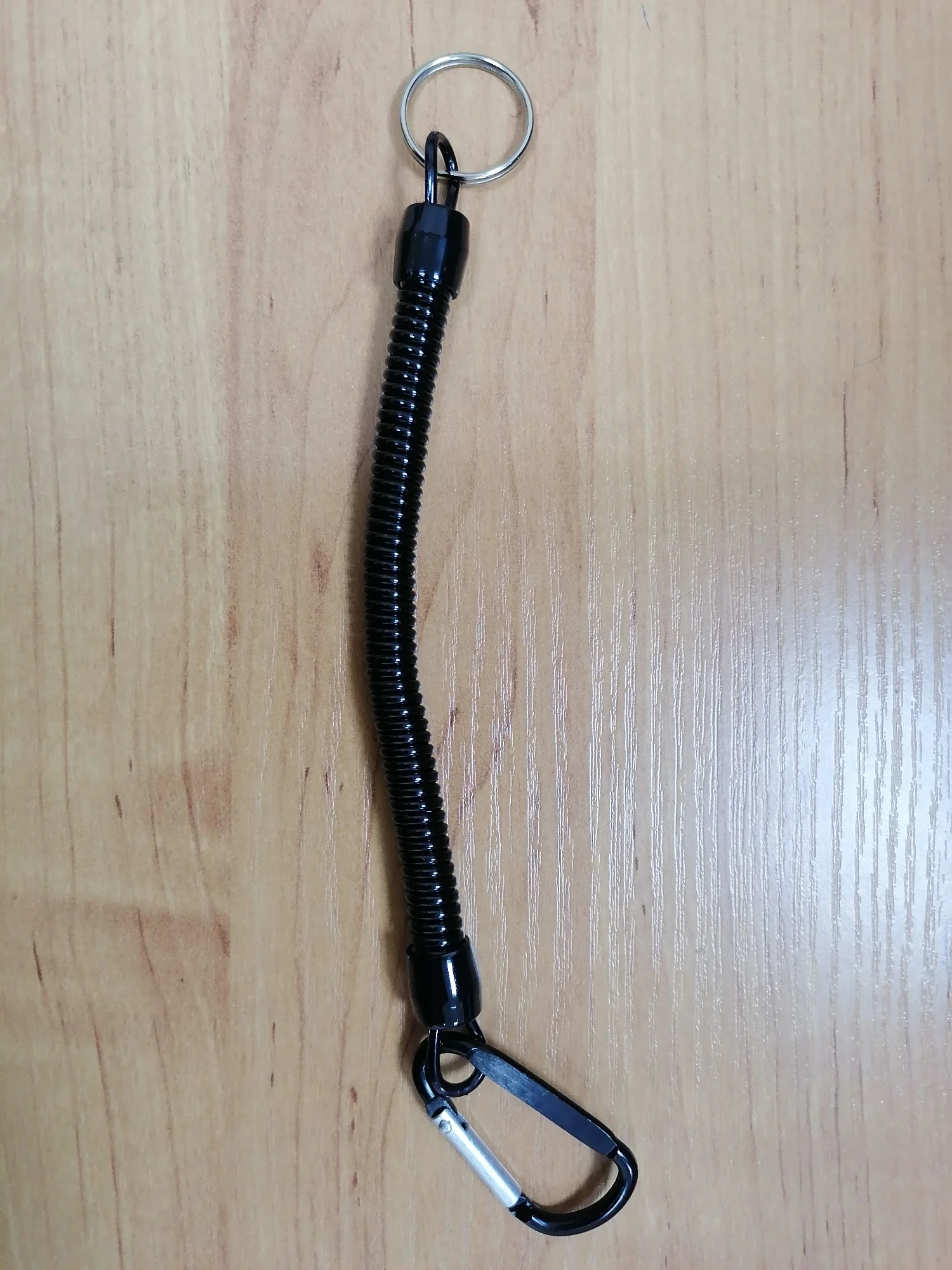 Хороший тренчик! Размер идеален для ножа. В свернувшемся состоянии длина 15 см, в растянутом-почти 80. Цельная полимерная спираль, концы которой сделаны пятлями и залиты в конечные колпачки.