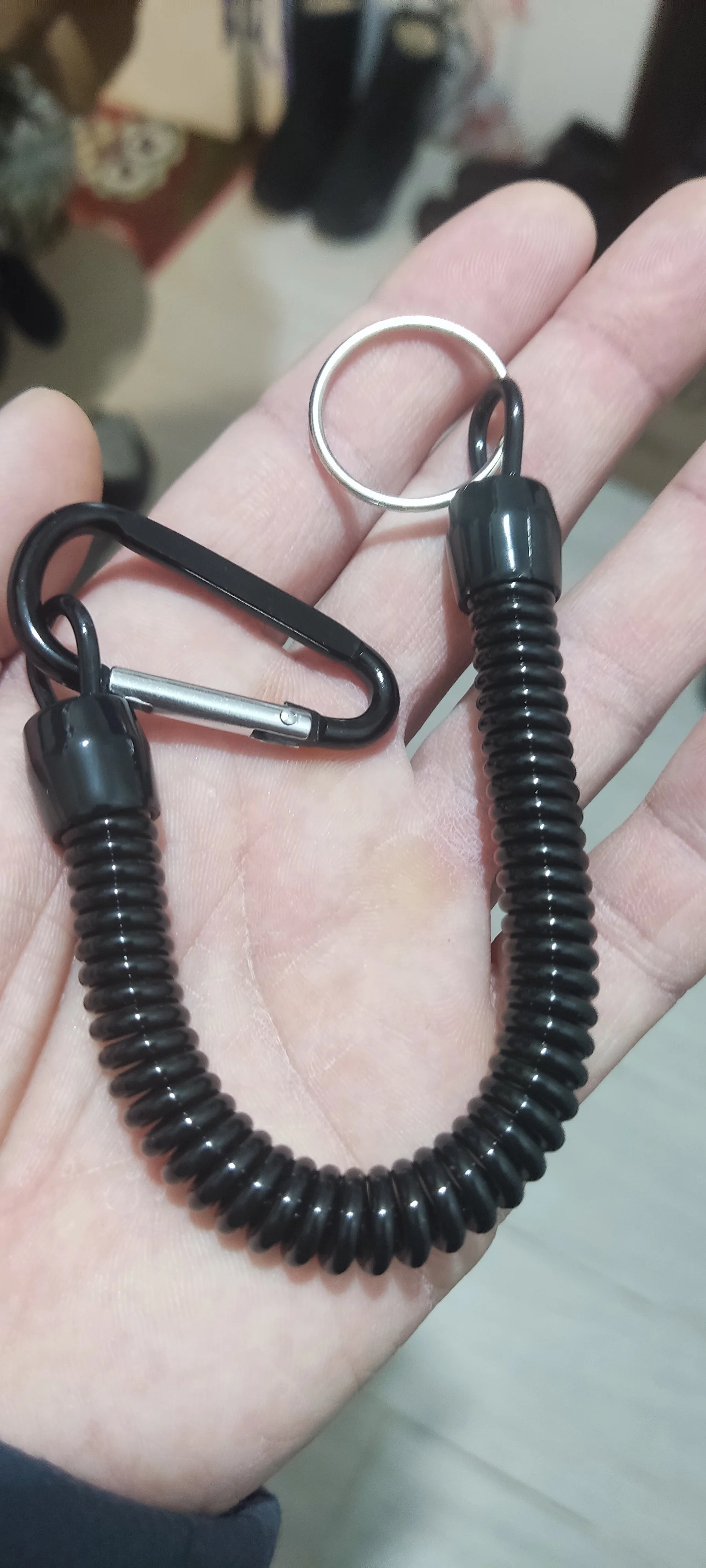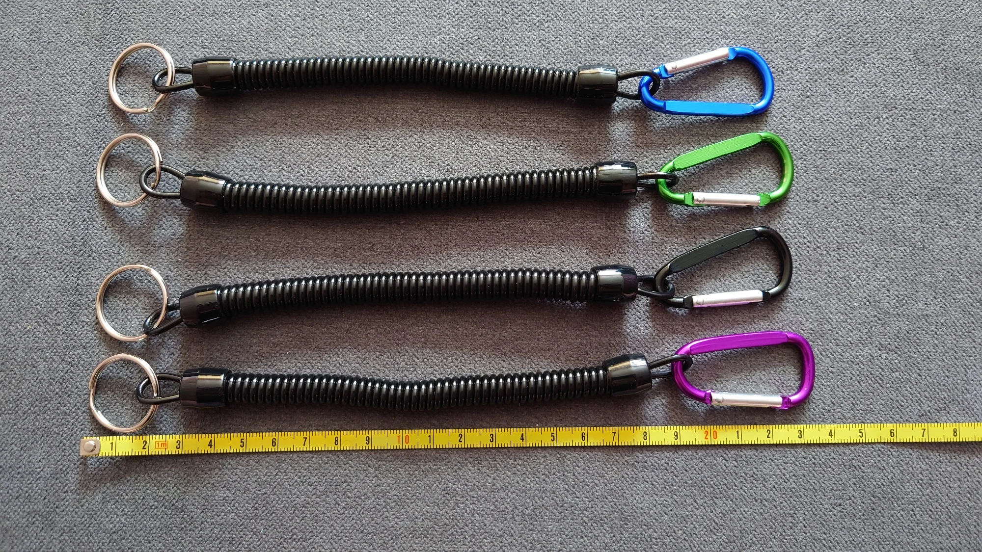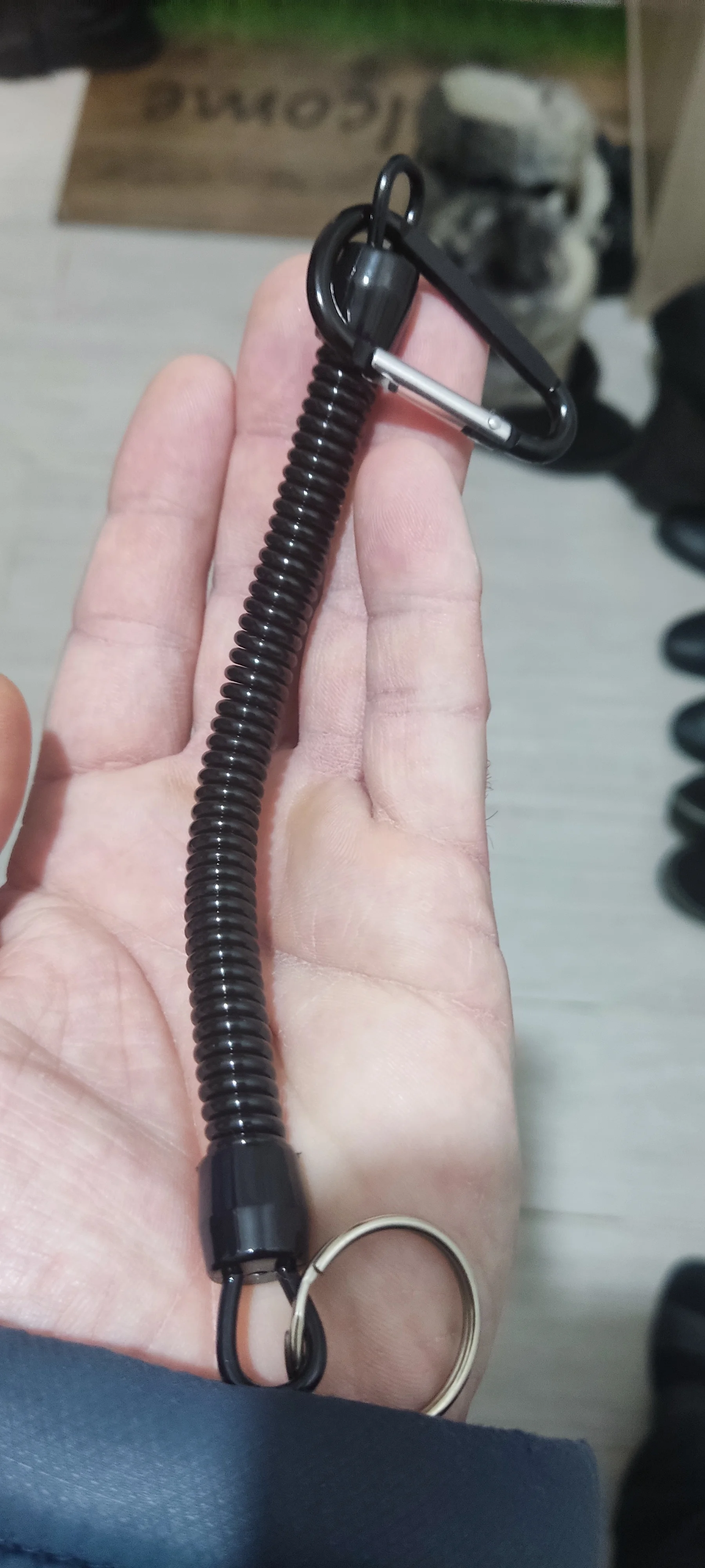 шнурки супер выглядит отлично размер на фото увидите растягивается на 90 см. карабин на пружине взял пристегивать всякий инструмент в лодке для рыбалки очень полезная штука, пришли быстро в сборной посылке, советую качество понравилось