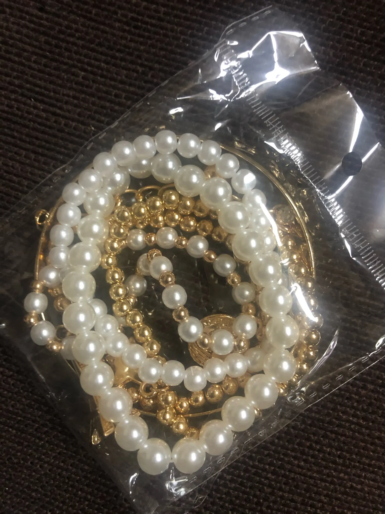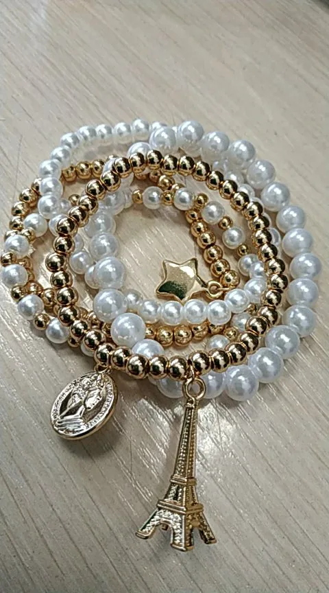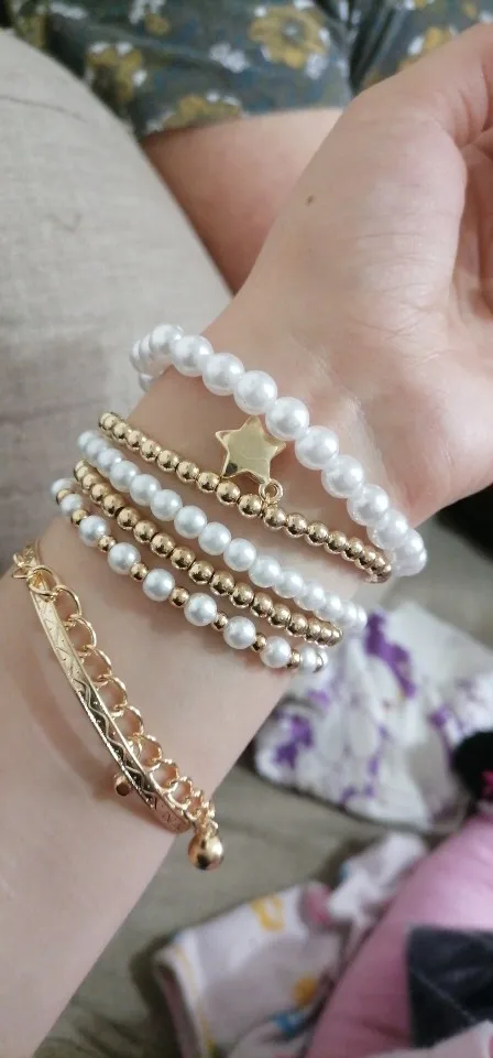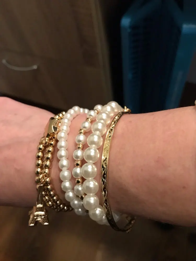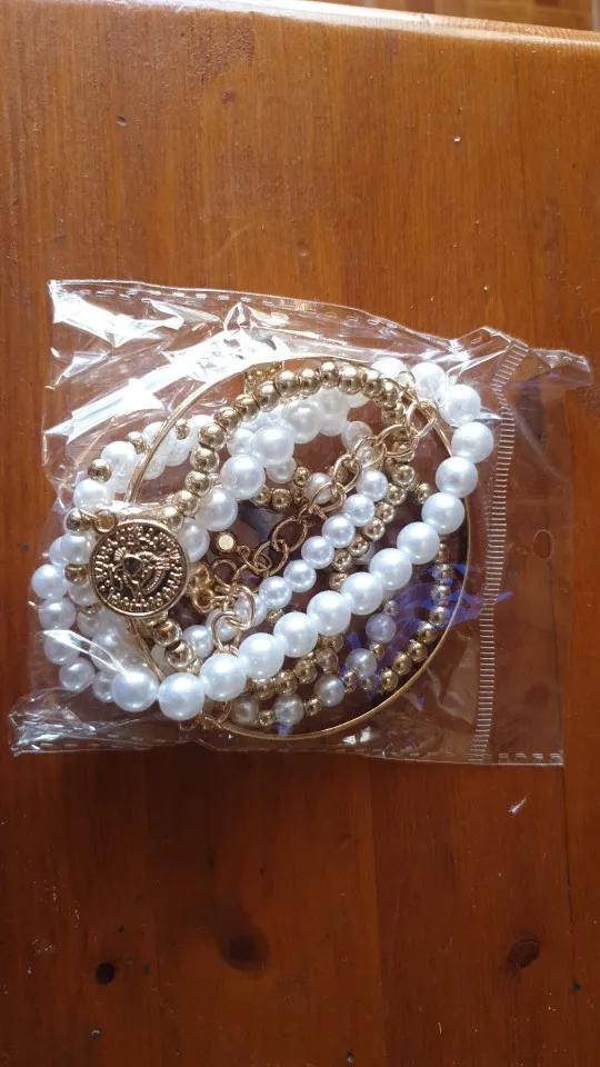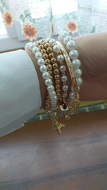 Даже с платой доставкой товар пришёл через 33 дня. Том о как на фото, плоский браслет болтается, остальные на леске-резинке. На раз-два надеть думаю сойдет