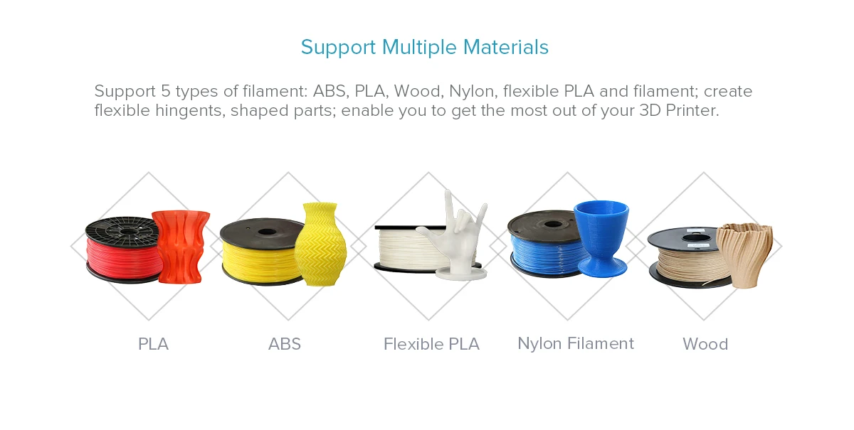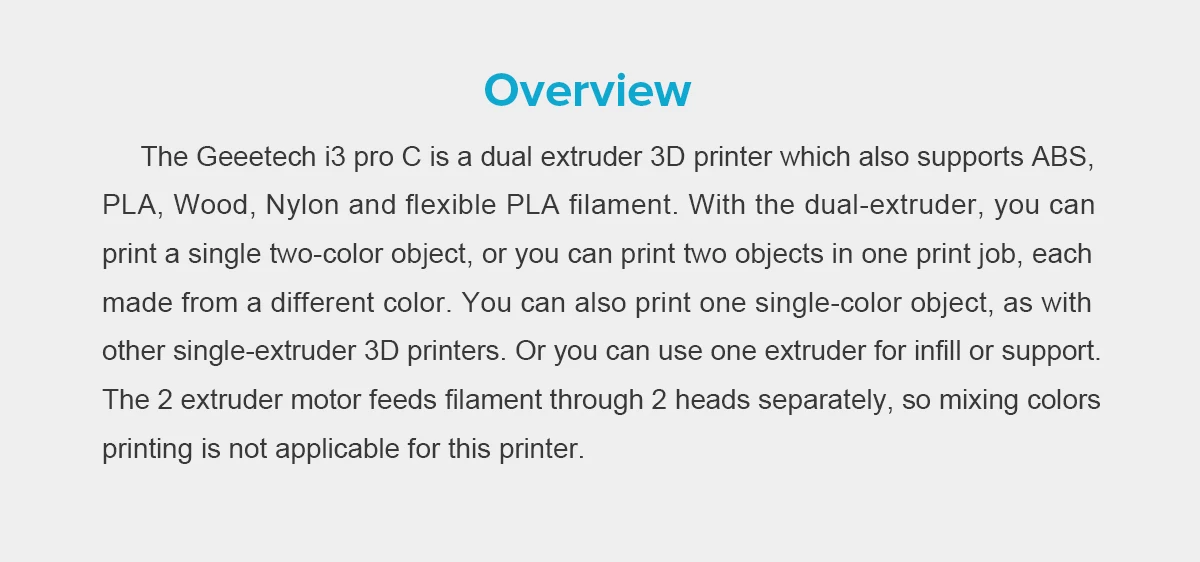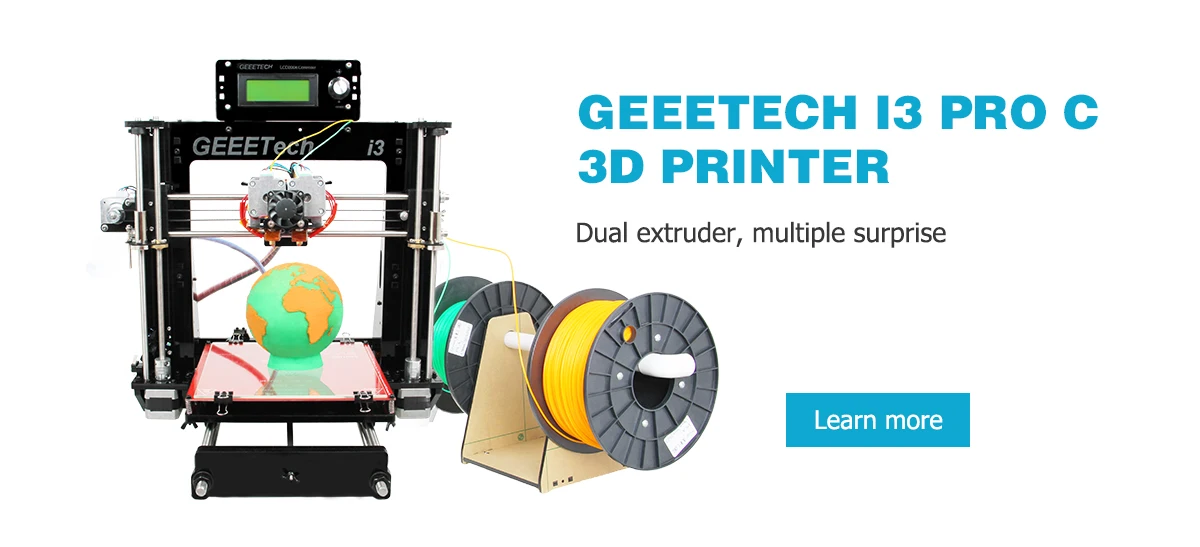 Geeetech I3 pro C поддерживает 5 типов филамента: ABS, PLA, древесно-полимерный, нейлоновый и гибкий PLA. Теперь с помощью двойного экструдера вы можете распечатать один двухцветный объект, или вы можете распечатать два объекта в одной задаче печати, каждый из которых выполнен из другого цвета. Вы также можете печатать один Одноцветный объект, как и другие 3D-принтеры с одним Экструдером. Или вы можете использовать один экструдер для заполнения или поддержки. 2 двигателя экструдера продвигают нить через 2 головки отдельно, поэтому смешивание цветов печати не применимо в данный момент.