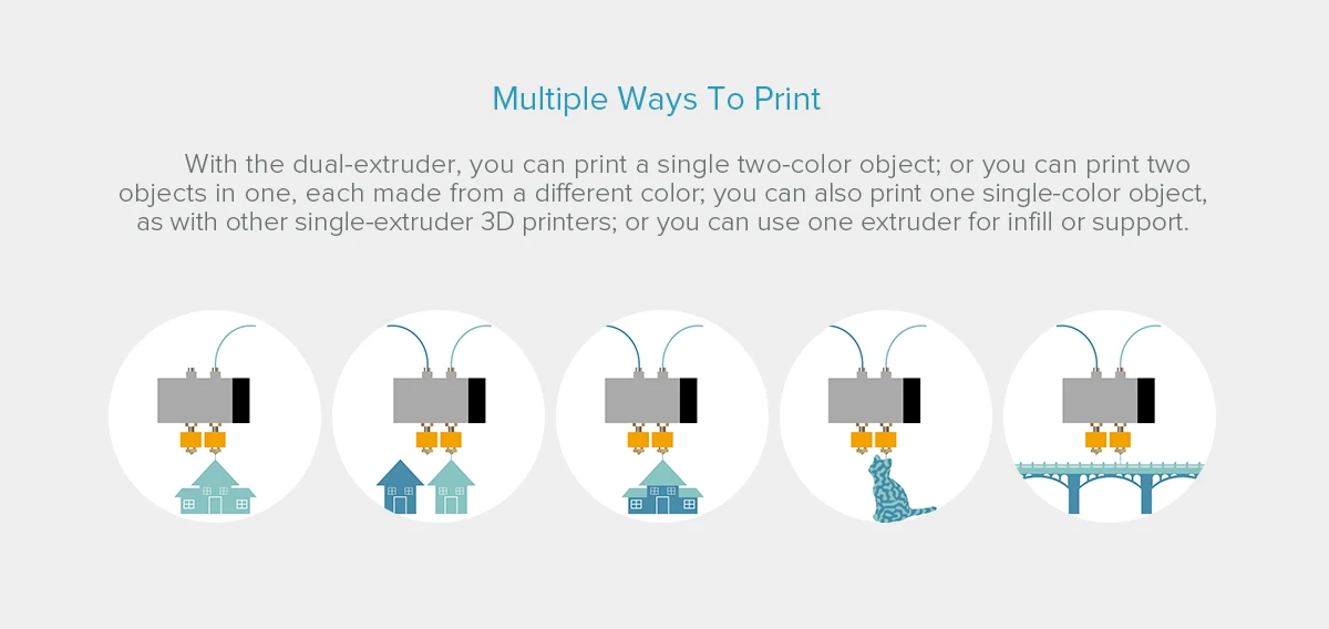 2. Двойной экструдер, Совместимость с несколькими нитями, несколько способов печати.
