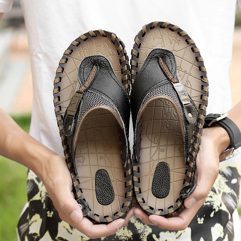 Удобные кожаные мужские шлепанцы, летние мужские сандалии, кожаные ...