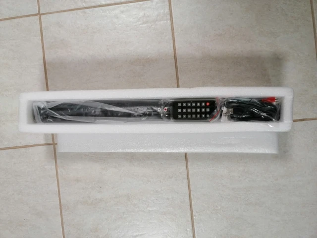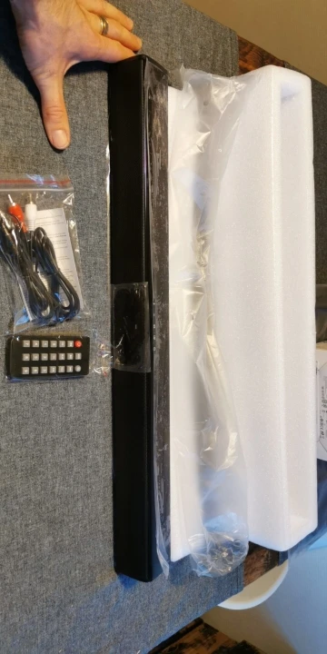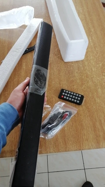 Muy contento con la barra de sonido. Estupenda relación calidad precio. Viene con cables y mando a distancia con pilas y además con la batería cargada. Llegó justo en el tiempo que indica su promoción.... Todo bien.