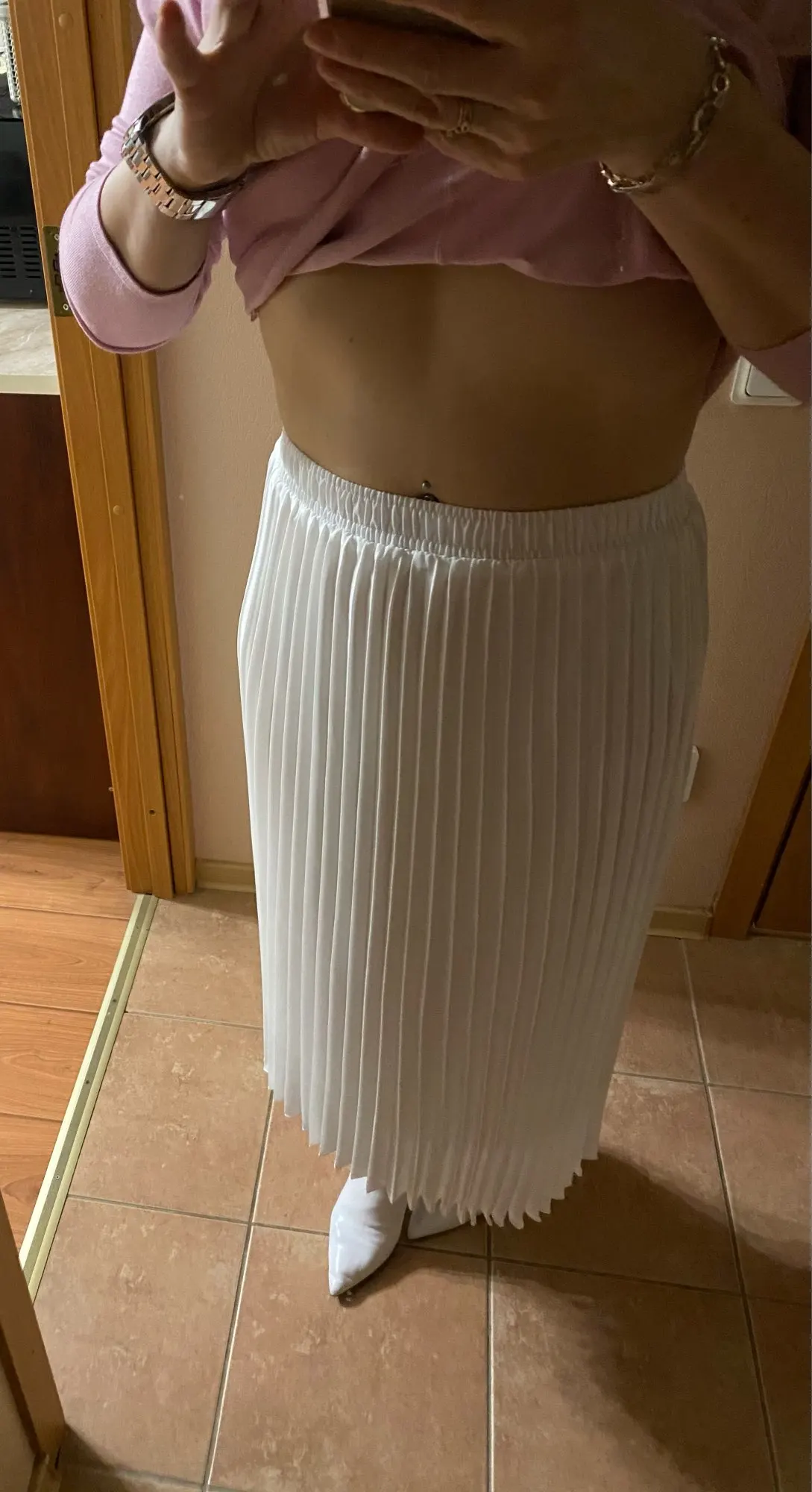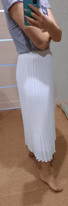 Офигенная юбка! Описание продавца соответствует действительности. Я заказала размер М, длина 80 см. Моя юбка (белая) при ярком освещении, если заправлять в неё темные вещи, немного просвечивает, но меня это не напрягает (просто не буду этого делать и всё, проблема решена) Пошив у юбки очень качественный, все швы ровные, нитки не торчат, подол очень аккуратно оверложен, пояс собран на широкую резинку и прошит равномерно, нигде не перекручивается, все складки четкие, без заломов. Имеются подкладка в цвет, технические лямки для вешалки,вшиты бирки с названием фирмы-производителя, с размером, с составом и рекомендациями об уходе. Юбку приобрела для тёплого времени года, но ради эксперимента попробовала надеть с сапогами, свитером под пальто, и осталась крайне довольна, юбка очень освежает образ в суровые зимние дни. Заказ продавец отправил быстро, а добрался он до меня, на самый север Карелии за 15 дней, что для нашего региона достаточно быстро. Продавца я смело могу рекомендовать⭐️⭐️⭐️⭐️⭐