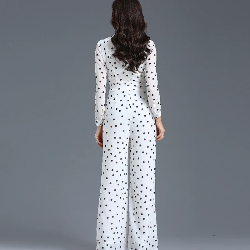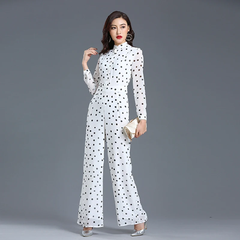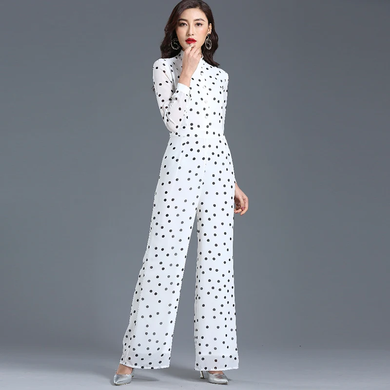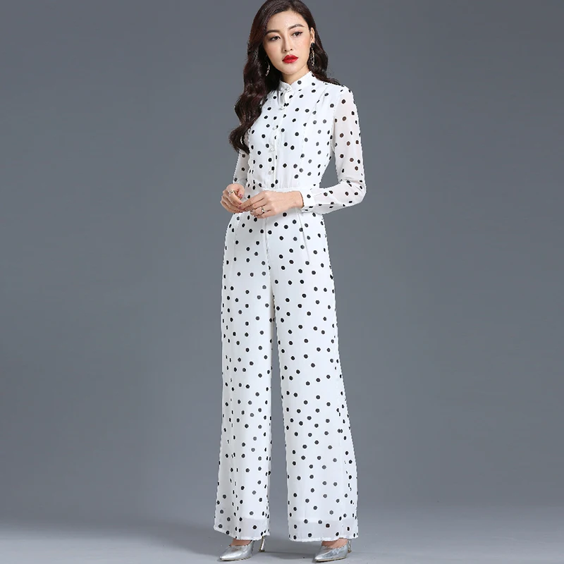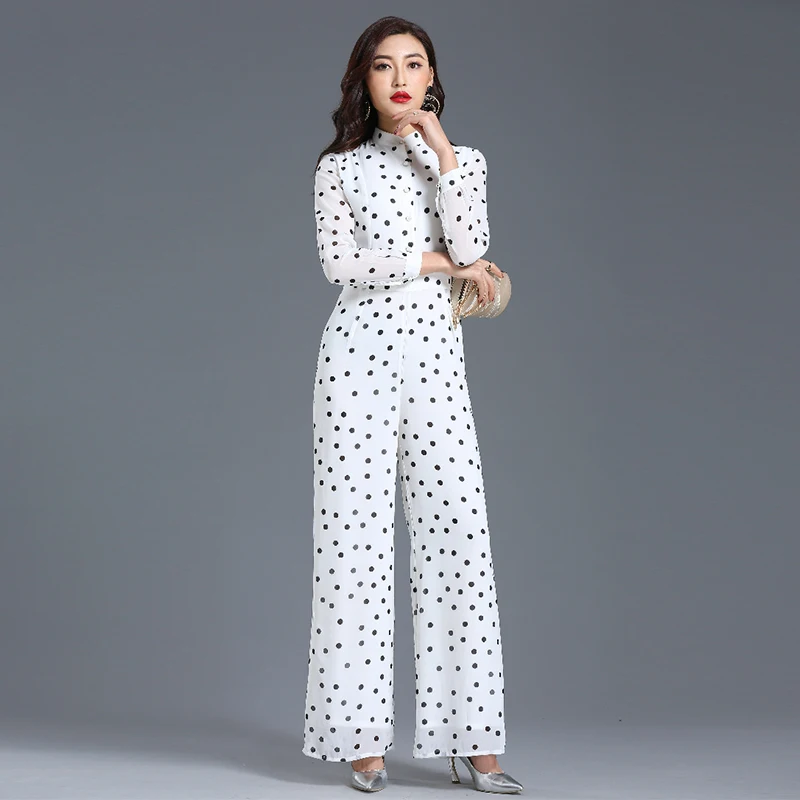 Женский праздничный комбинезон, шифоновый комбинезон в горошек с длинным рукавом, элегантные длинные комбинезоны в стиле High Street с широкими штанинами, 3XL, 4XL, осень 2020