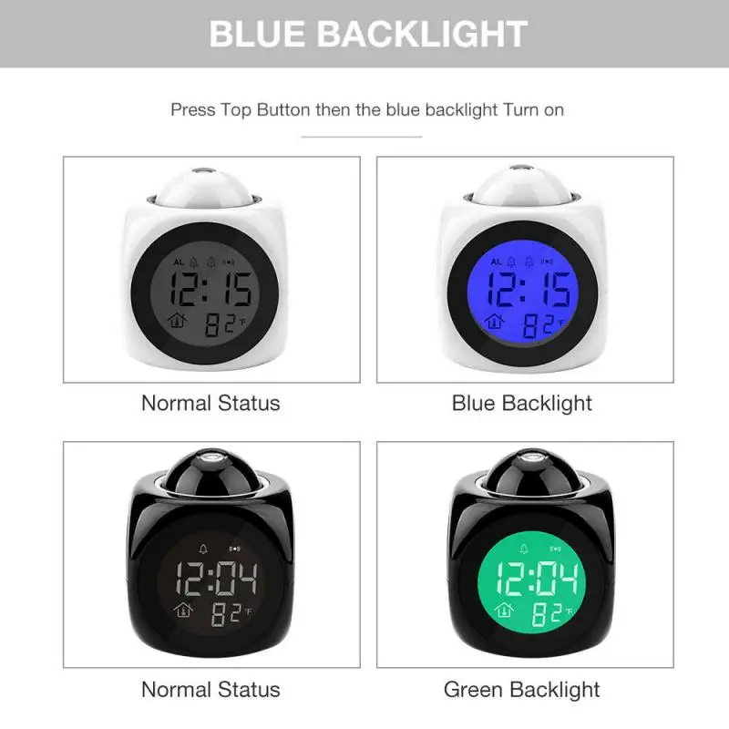 Регулируемый Поворотный проектор, в любом режиме, нажмите верхнюю кнопку, чтобы сообщить время с подсветкой и проекцией около 10 секунд