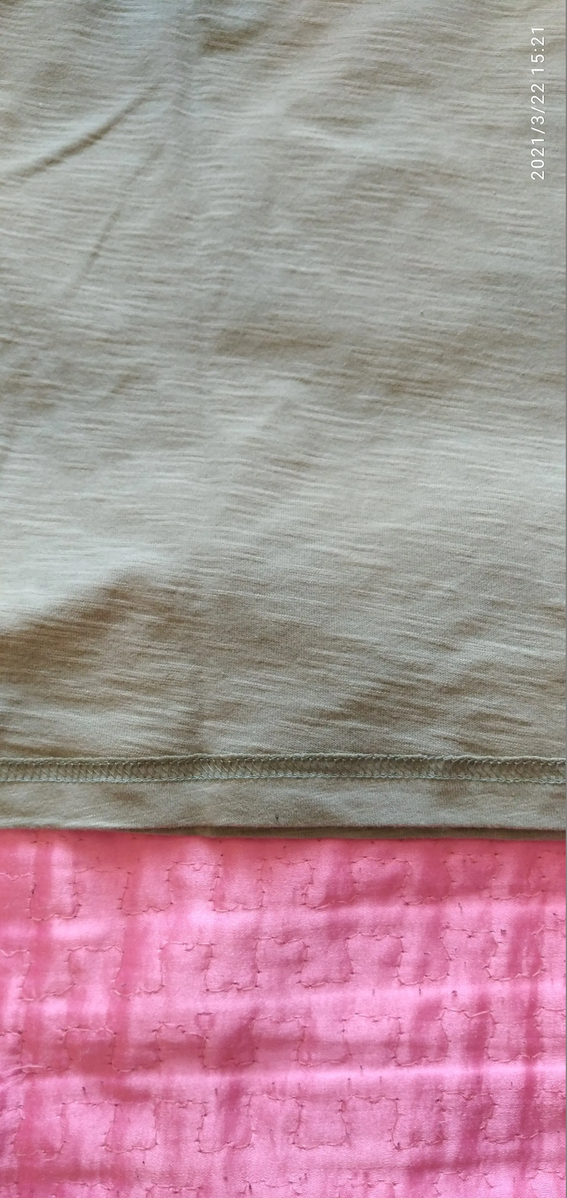 Заказ пришел быстро - до Самары за 20 дней. Но я так разочарована... Вместо красивого бирюзового цвета футболка оказалась светло зелёной. И такое впечатление, что ткань скроена по косой. Боюсь, что после стирки футболка перекрутится по спирали - и боковые швы будут не ровными. Ткань плотная, не однородная, а как бы "березкой". Своих денег не стоит. Ужасно обидно... По размеру ничего сказать не могу - не примеряли. Для сравнения рядом старая БИРЮЗОВАЯ футболка и ежедневник.