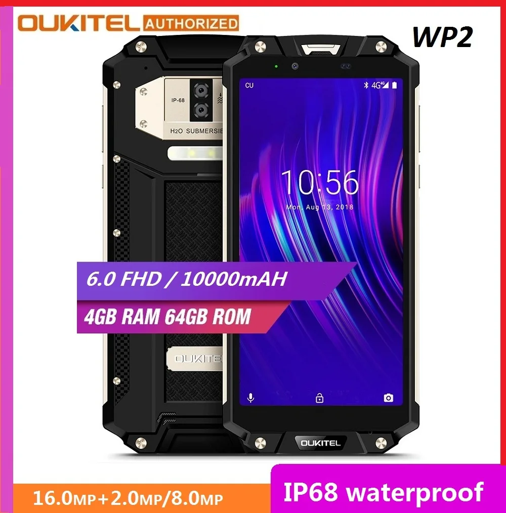 Ударопрочный смартфон OUKITEL WP2, 4 ГБ+64 ГБ, MT6750T восемь ядер, 6-дюймовый дисплей 18:9, 10000 мАч, сканер отпечатков пальцев, водозащита IP68, пылезащищенный мобильный телефон