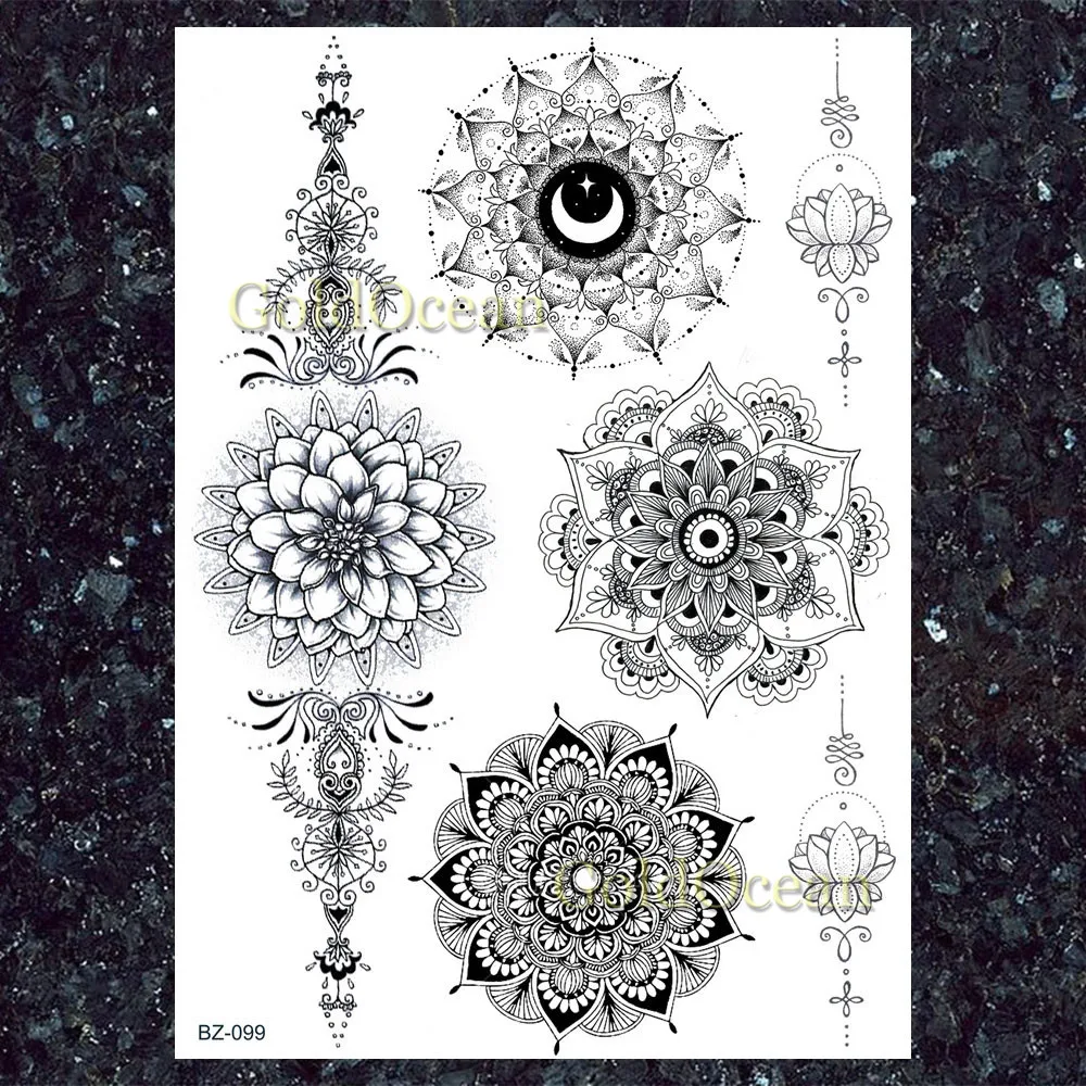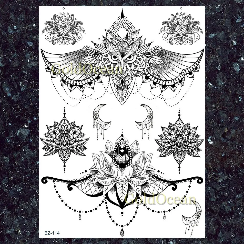Сексуальные черные Временные татуировки хной, кружевные Подвески в виде лотоса, татуировки для женщин, искусство тела, груди, искусство для взрослых, волк, Сова, ювелирные изделия, тату-наклейки