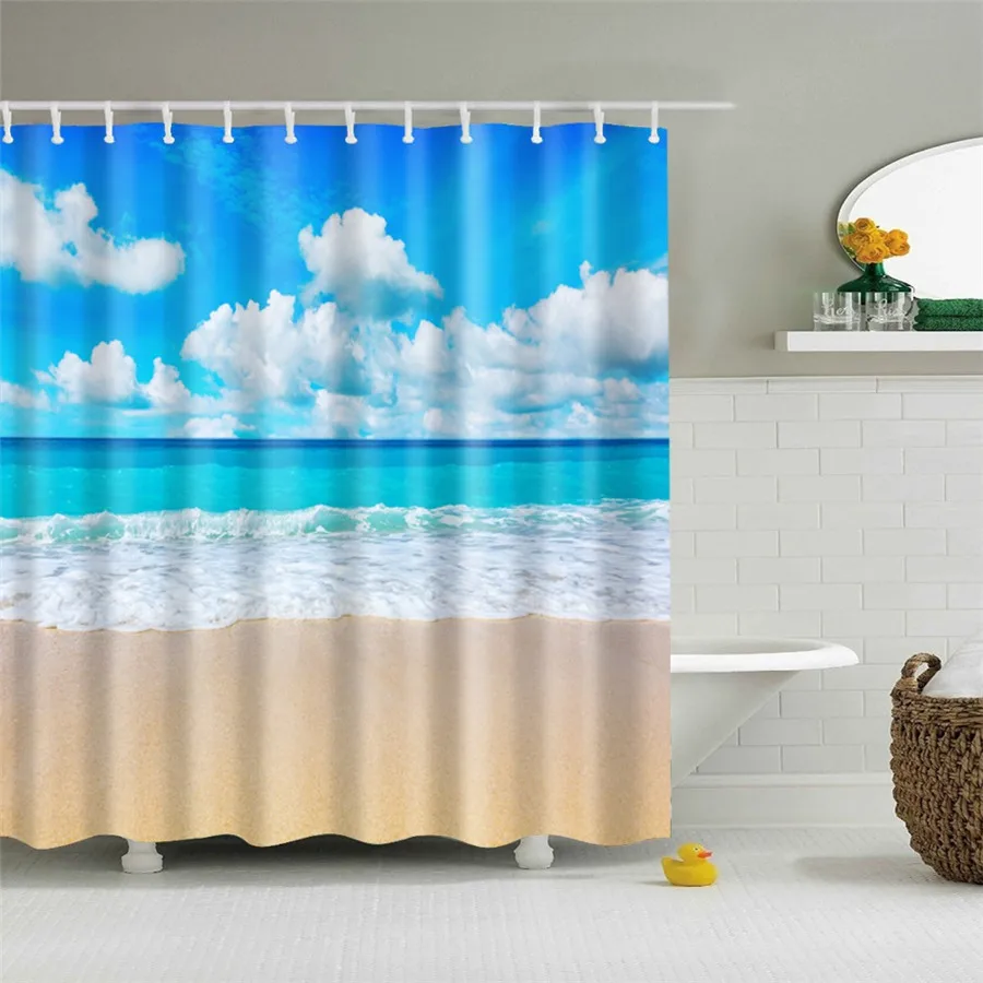 Современная шторка для душа с морским пляжем и принтом, голубая зан...