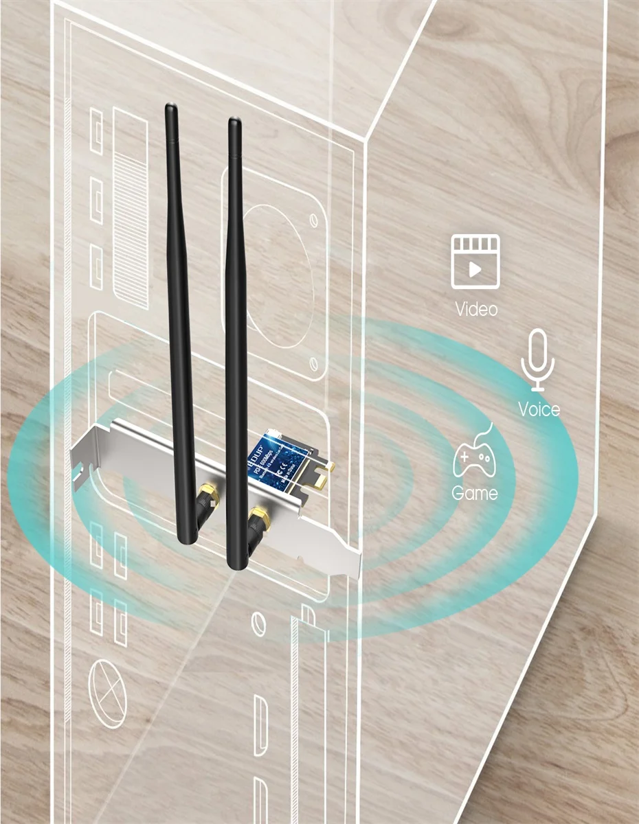 1. Соответствует IEEE 802.11ac IEEE 802.11n/a/b/g. 2,4G/5G двухчастотный опционально, 5G Гц Частота частот до 867 Мбит/с, частота частот 2,4 ГГц до 300 Мбит/с.2. Антенна: 2 * 5dBi Двухдиапазонные съемные всенаправленные антенны.3. Операционная система, Windows 7/8/8.1/10/11.4. Синий зуб 4,0, доступен для 10-30 метров (без каких-либо блоков)