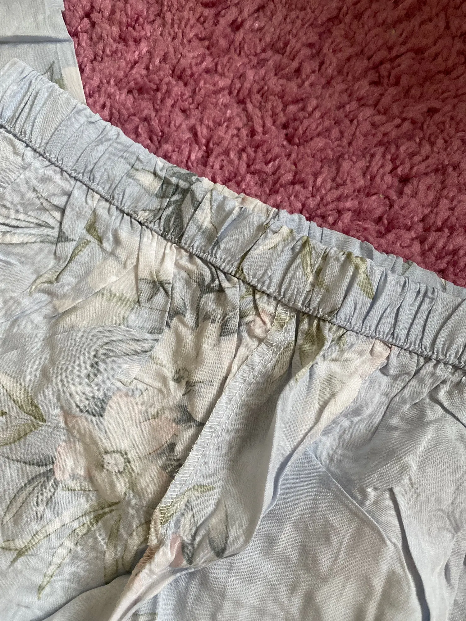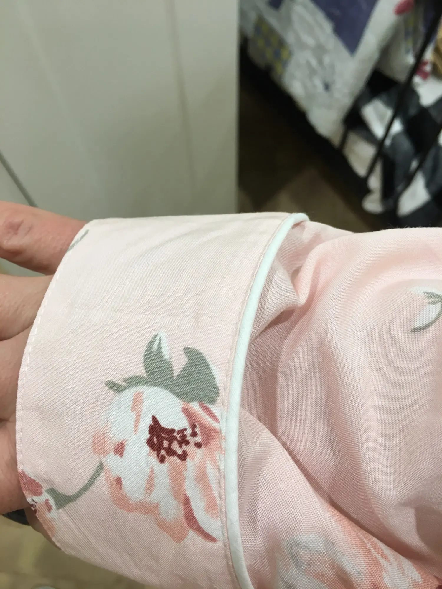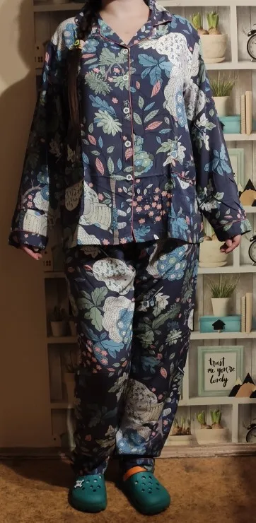 Ткань мягкая нежная и принт красивый, но рукава мне немного длинноваты (рост 162см) а резинка на талии туговата для домашней одежды (моя талия 70см) и пуговицы слишком дешевые. Но ткань компенсирует это все.