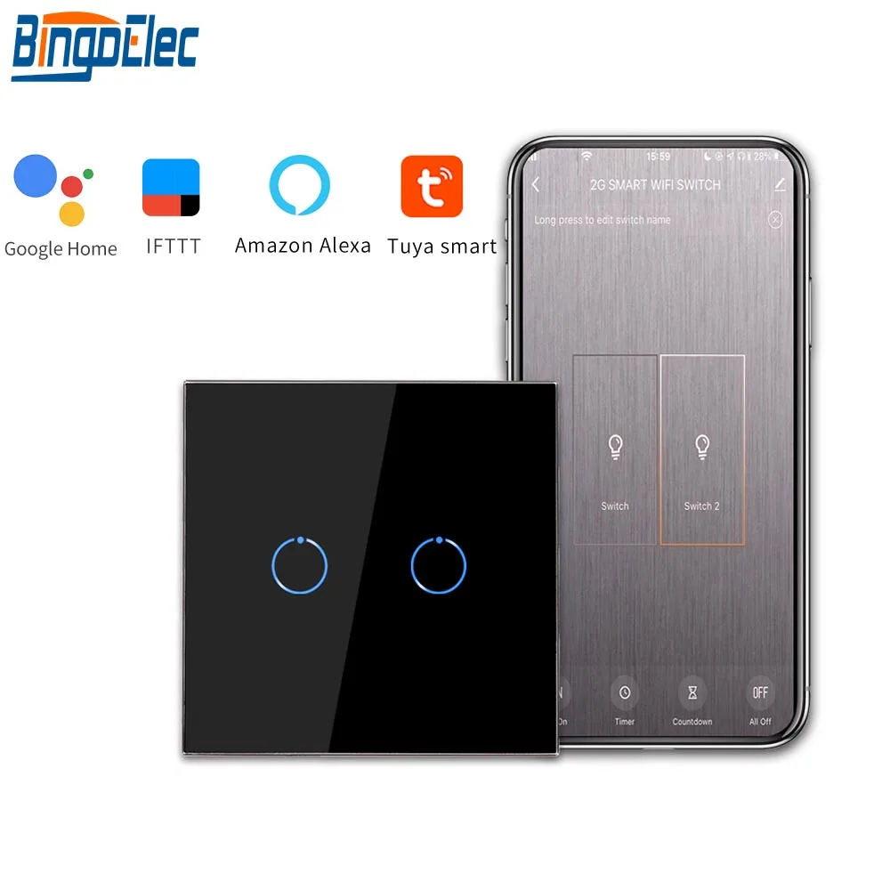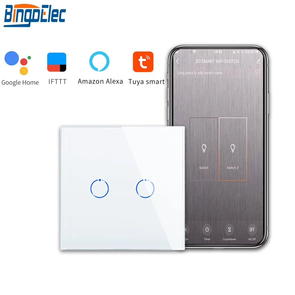 Сенсорный выключатель Bingoelec, ЕвропейскийБританский стандарт, Wi-Fi, 2 клавиши, 1 канал, умный светильник ель с белым хрустальным стеклом, работает с Alexa Google Home