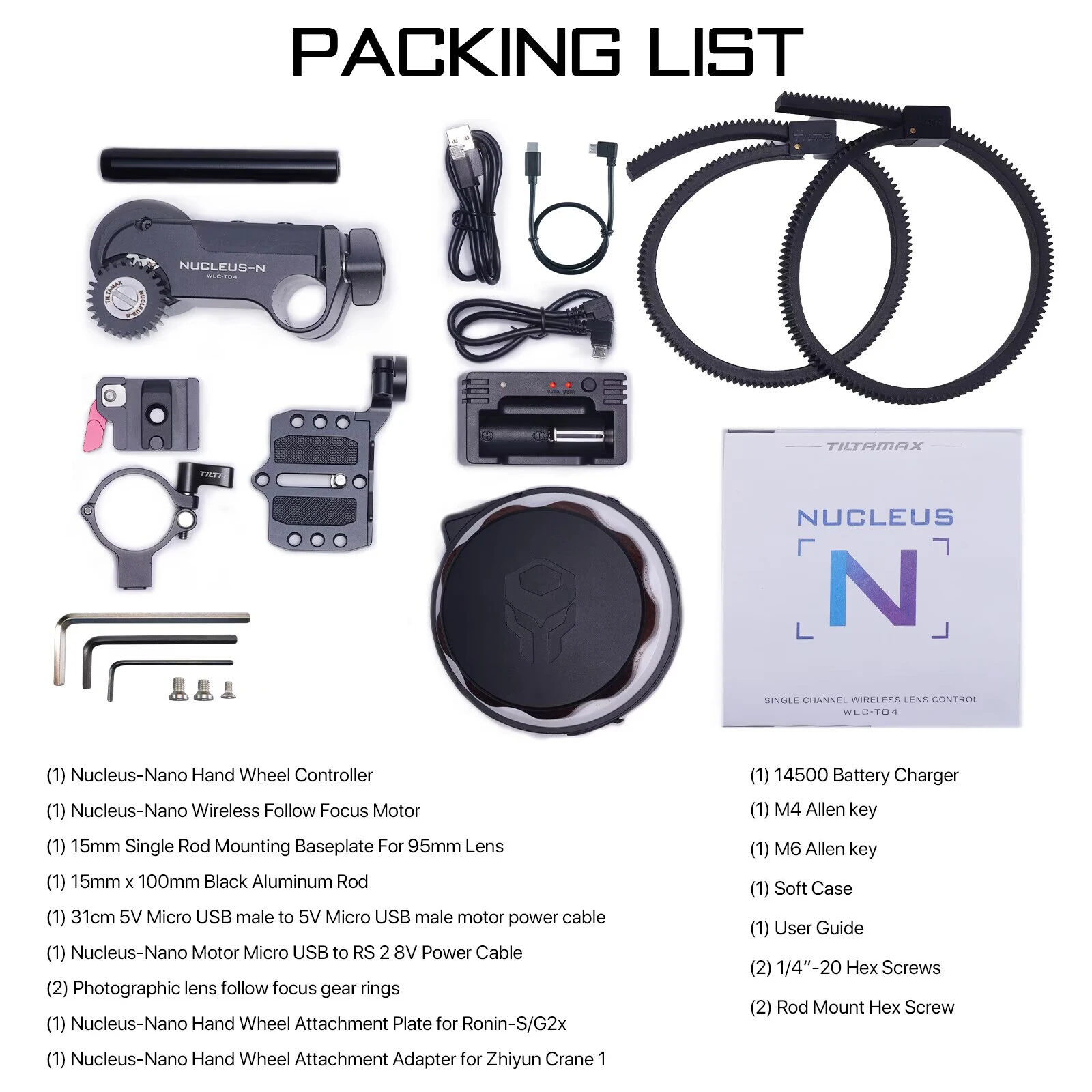 Посылка включает в себя опции Nucleus-Nano контроллер ручного колеса беспроводной мотор слежения за фокусом включает в себя: nucleus-Nano контроллер ручного колеса 1 Nucleus-Nano беспроводной мотор для непрерывного фокуса 1 15 мм одиночный стержень Монтажная пластина для объектива 95 мм 1 15 мм x 100 мм черный алюминий Rod1 31 см 5 в Micro USB от male до 5V Micro USB кабель питания для электродвигателя 1 объектив для фотосъемки кольца для фокуса 2 ядра-Нано пластина для крепления ручного колеса для Ronin-S/G2x 1 ядро-Нано насадка-адаптер для ручного колеса для Zhiyun Crane 1 RoninS 12V to кабель питания Micro USB 1 14500 зарядное устройство 1 14500 батареи 2 Руководство пользователя 1