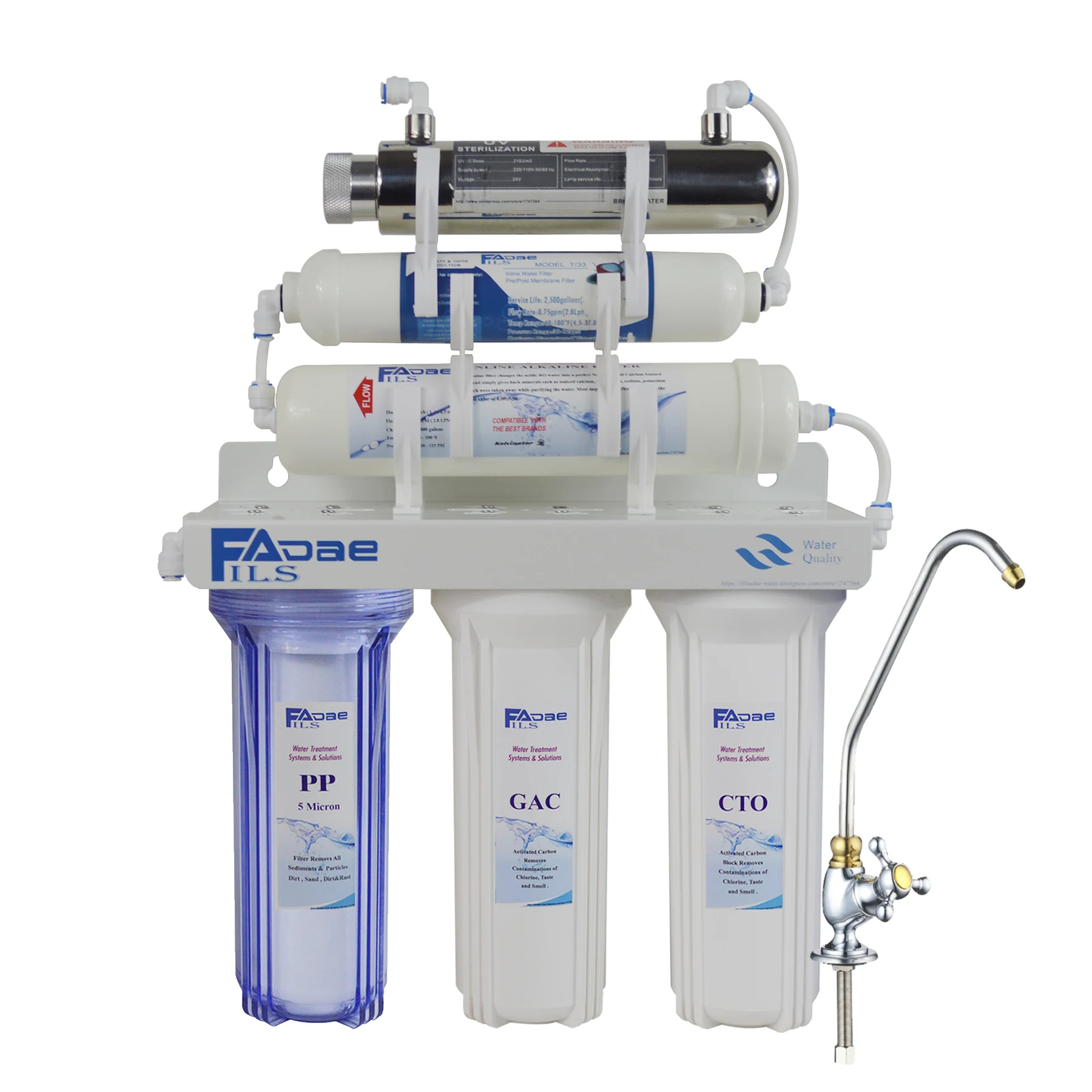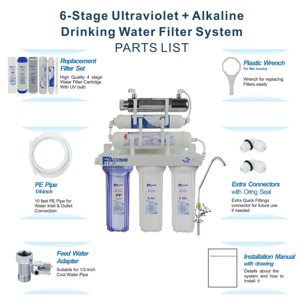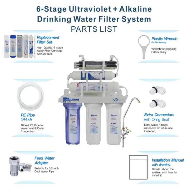 ВШесть стадий Undersink щелочной питьевой воды фильтр системы с УФ стерилизаторВключает в себя все необходимое для установки под раковиной. -Система фильтрации под раковиной. -Ультрафиолетовая фильтрация достигается с помощью ультрафиолетовых ламп: вода отправляется через корпус потока; По мере того как вода проходит через УФ-лампу, микробы в воде подвержены воздействию УФ-лучей. С фильтром Alklaine с ph 8,00-9,50 после фильтра