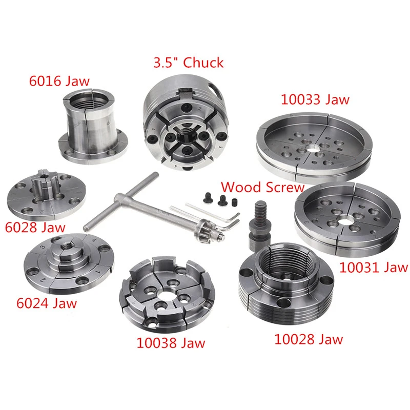 Посылка включает в себя:1x3,5 дюймов токарный патрон(Поставляется с резьбой по дереву, удобной Т-образной ручкой и 2 "Челюсти по стандарту)Или1 x челюсть