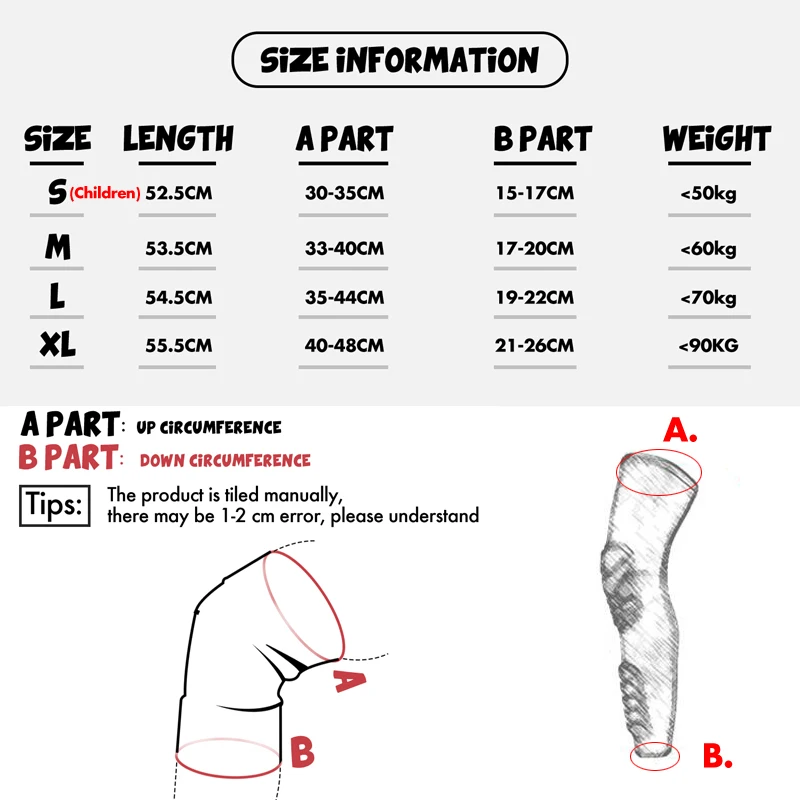 S -- бедра 30-35 см, окружность голени 15-17 нм, длина 52,5 см, Рекомендуемая окружность ноги 34-44 см, вес <45 кгM-Бедро 33-40 см, окружность голени 17-20 см, длина 53,5 см, Рекомендуемая окружность ноги 36-46 см, вес <60 кгL -- обхват бедра 35-44 см, обхват голени 19-22 см, длина 54,5 см, рекомендуемый обхват ноги 38-48 см, вес <70 кгXL-бедра 40-48 см, circumference21-26cm икры, длина 55,5 см, Рекомендуемая окружность ноги 40-52 см, вес <90 кгXXL-бедра 45-55 см, circumference22-30cm икры, длина 55,5 см, рекомендуемый обхват ноги 42-54 см, вес <100 кг