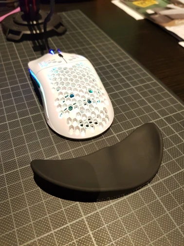 es una pieza pequeña, coge la Palma de la mano por la zona de la muleca ergonómicamente, está hecha de goma dura y sigue el movimiento de la mano con el ratón, te acostumbras rápido.