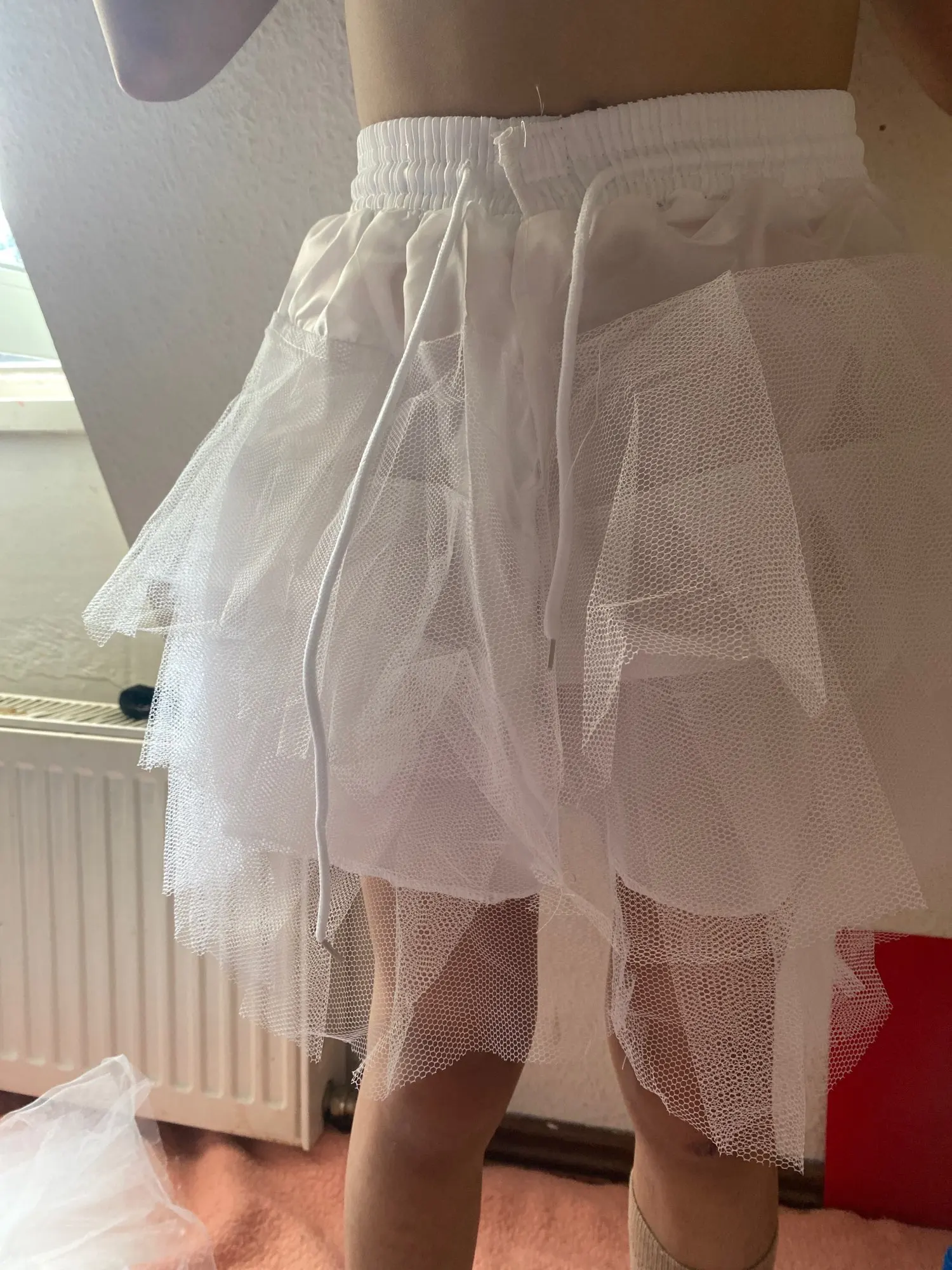 Отличный короткий подьюбник длина 35 см, жесткая сетка. Липучка и завязки подойдет на худеньких. На 6-7 лет под короткие платья идеально