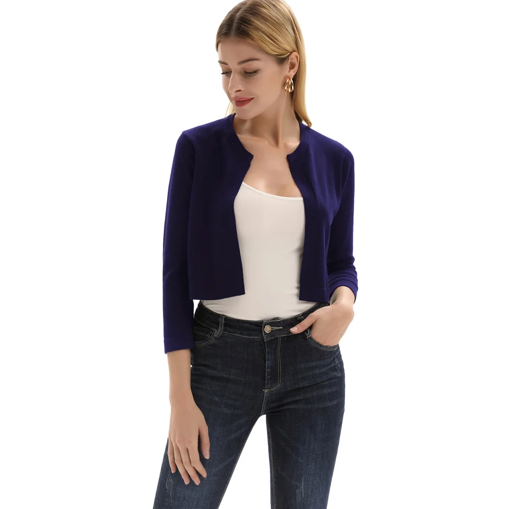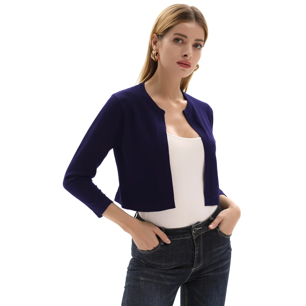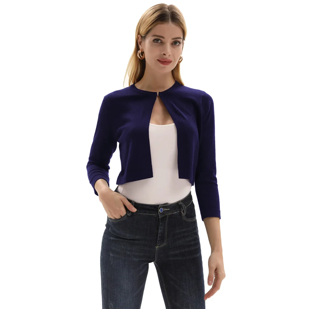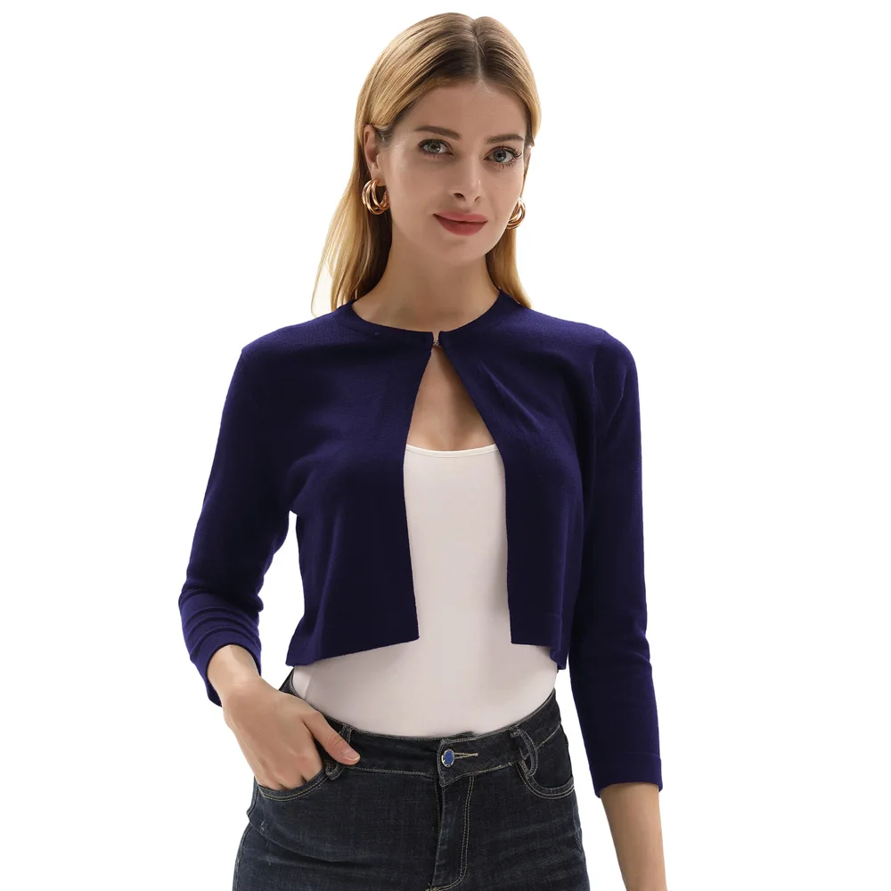 Женский трикотажный кардиган, однотонная винтажная трикотажная куртка с рукавом 34 и круглым вырезом, укороченная длина
