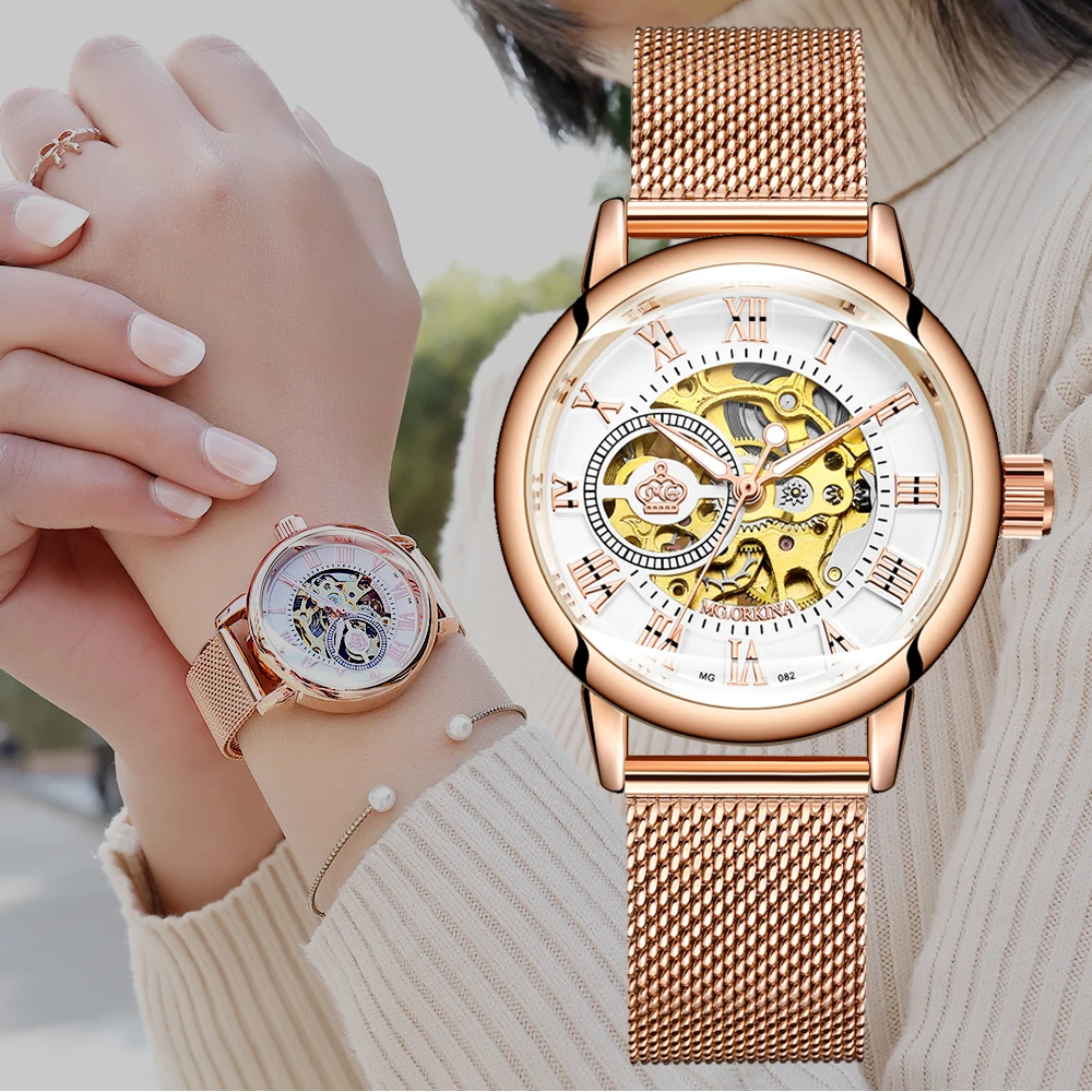 Часы женские ORKINA механические, розовое золото, автоматические, 2020