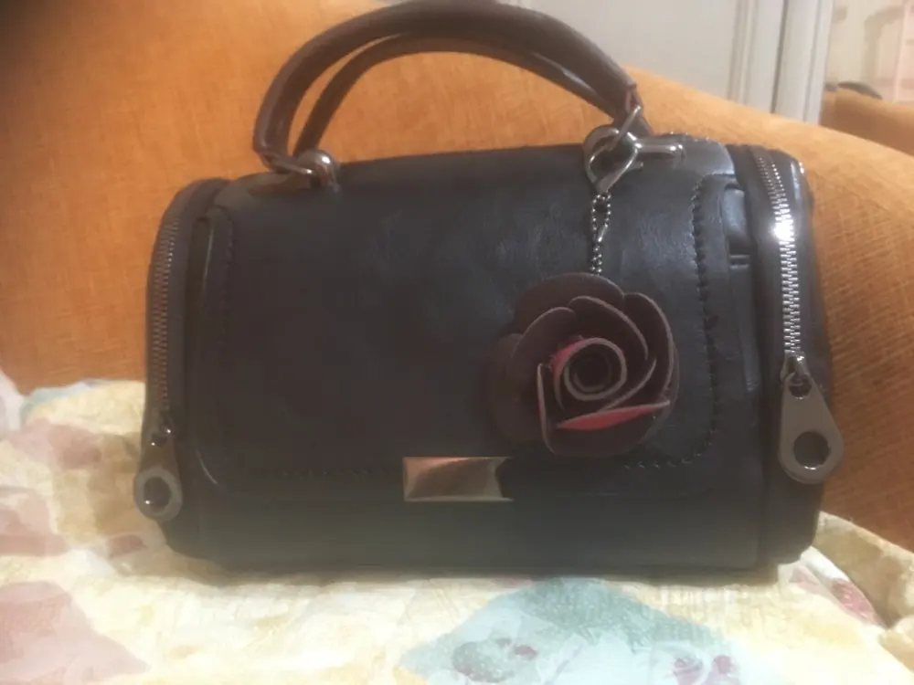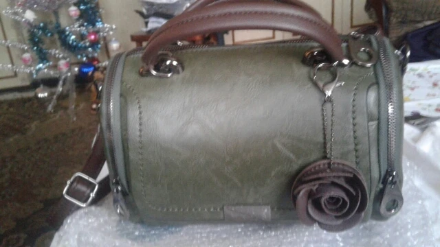 Посылка шла 19 дней, отслеживалась. Сумка приглушенного бледно-коричневого цвета. Сумка почти цилиндрической формы. Внутри сумки был воздушный пузырь для транспортировки. Украшена сумка искусственной розой, крепится на карабинчике. Есть короткие плотные ручки и есть длинная регулируемая ручка, чтобы носить сумку через плечо или на плече. Внутри сумки всего одно отделение без перегородок, но есть один кармашек без молнии. Спереди под большим откидным клапаном есть карман, без молнии, застегивается на хороший магнит. Сзади сумки тоже есть карман, но он очень неглубокий, помещается туда лишь авторучка, и этот карман на молнии. Также есть хорошие карманы по бокам сумки, которые на молнии. Удобно туда складывать товары, которые нужно быстро достать при необходимости. На дне полусферические металлические ножки. Не тяжелая сумка из искусственной кожи. Сумка понравилась.